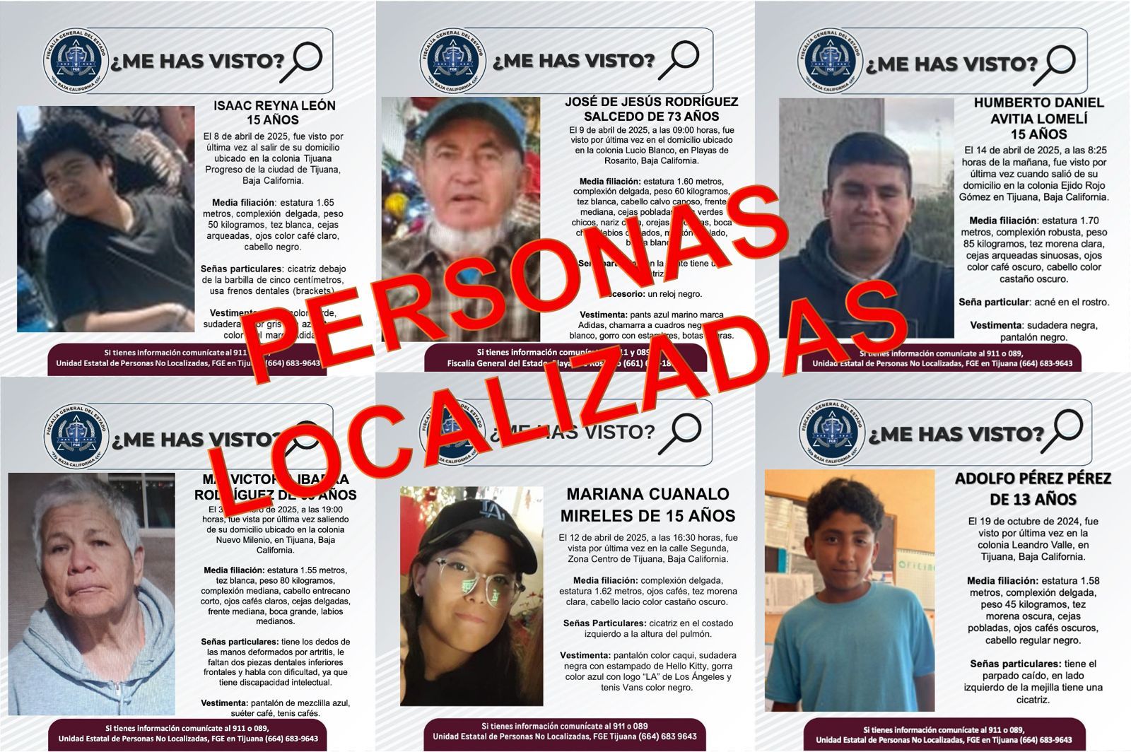 TIJUANA, BAJA CALIFORNIA. - La Fiscalía General del Estado localizó a seis personas que habían sido reportadas como no localizadas. Son dos mujeres y cuatro hombres, quienes fueron encontradas con buen estado de salud.