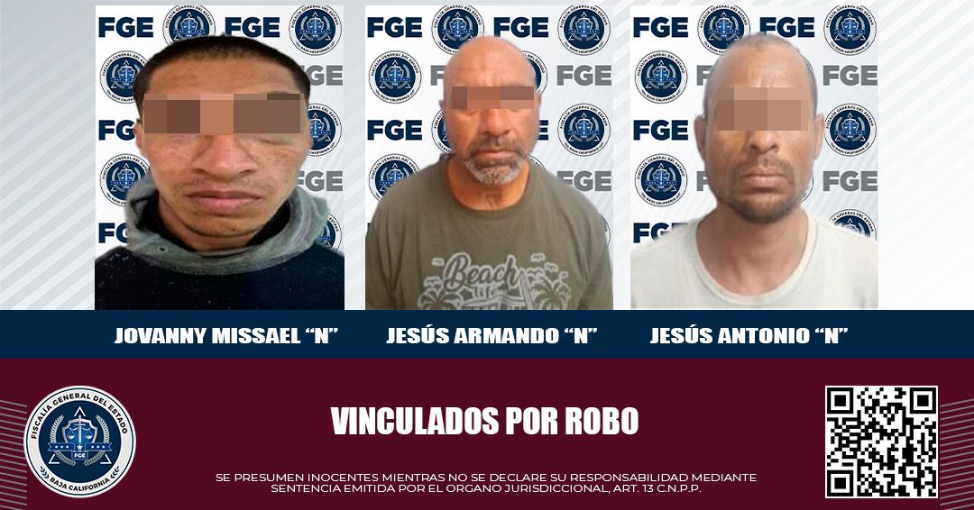 MEXICALI, BAJA CALIFORNIA. - La Fiscalía Regional de Mexicali, a través de las Unidades de Investigación de Robos Poniente y Detenidos Oriente, obtuvo, con base en los elementos de prueba, la vinculación a proceso de tres personas relacionadas con diversos hechos delictivos de robo.