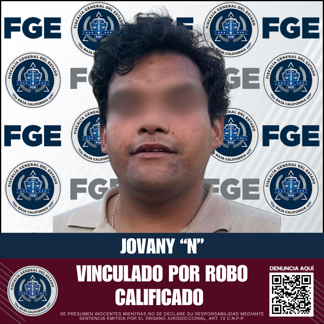 ENSENADA, BAJA CALIFORNIA - Como resultado de las investigaciones realizadas por la Fiscalía Regional de Ensenada, a través de la Unidad de Investigación de Robos, se obtuvo la vinculación a proceso de Jovany “N” por el delito de robo calificado.