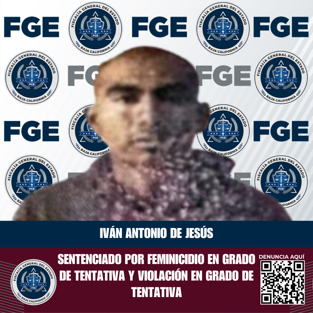 ENSENADA, BAJA CALIFORNIA. - La Fiscalía General del Estado, encabezada por la Dra. Ma. Elena Andrade Ramírez, a través de la Fiscalía Especializada en Delitos Cometidos Contra las Mujeres por Razón de Género, obtuvo una sentencia condenatoria de 53 años de prisión contra Iván Antonio de Jesús, por los delitos de feminicidio en grado de tentativa y violación en grado de tentativa.