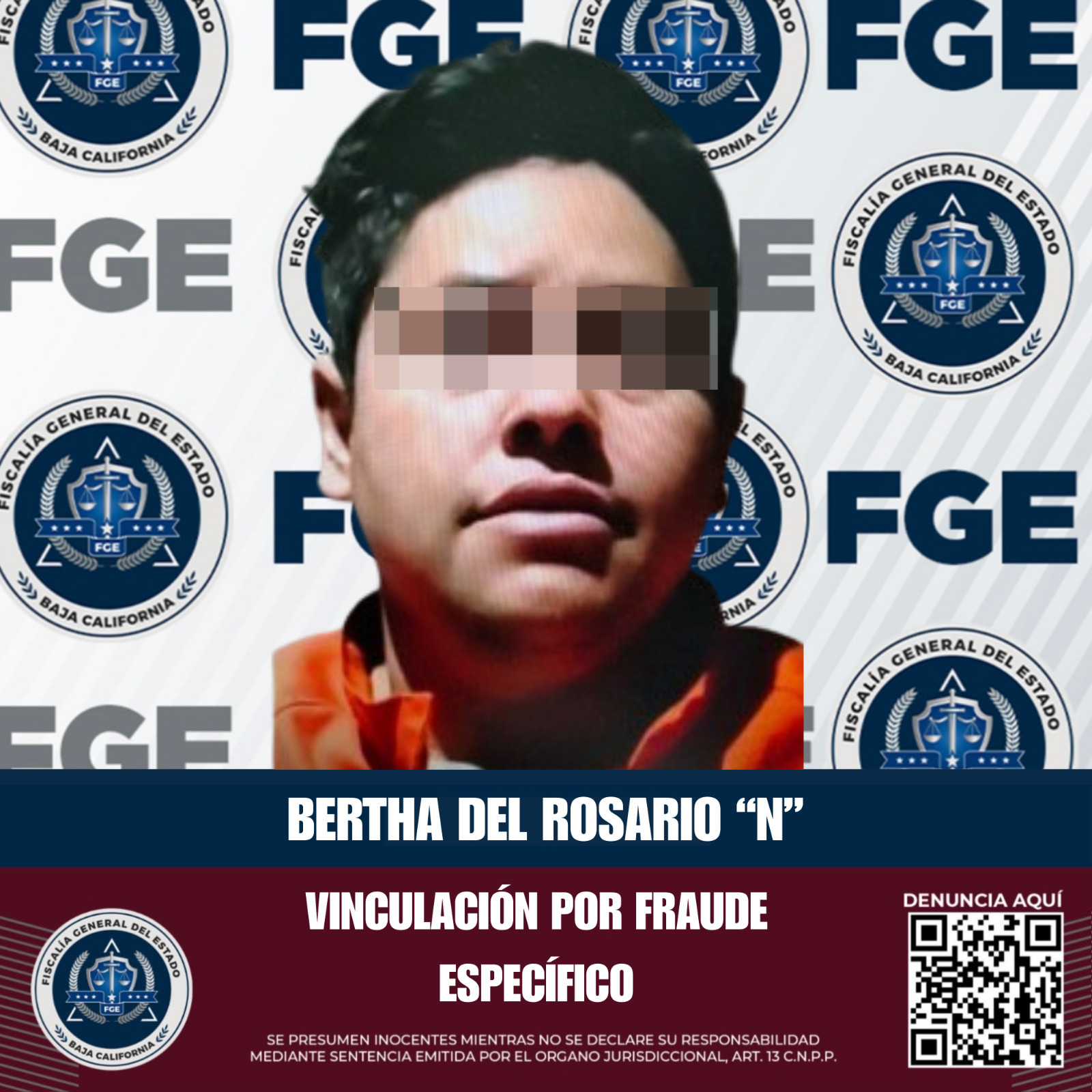 ROSARITO, BAJA CALIFORNIA. - La Fiscalía Regional de Playas de Rosarito, informa sobre los avances en el combate a delitos patrimoniales, logrando la vinculación a proceso de Bertha del Rosario “N”, también conocida como Erick “N”, por su presunta responsabilidad en el delito de fraude específico.