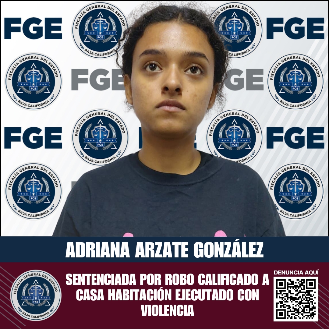 ENSENADA, BAJA CALIFORNIA. - La Fiscalía General del Estado, a través de la Fiscalía Regional de Ensenada, obtuvo una sentencia condenatoria contra Adriana Arzate González por el delito de robo calificado a casa habitación ejecutado con violencia, en hechos ocurridos en el año 2023.