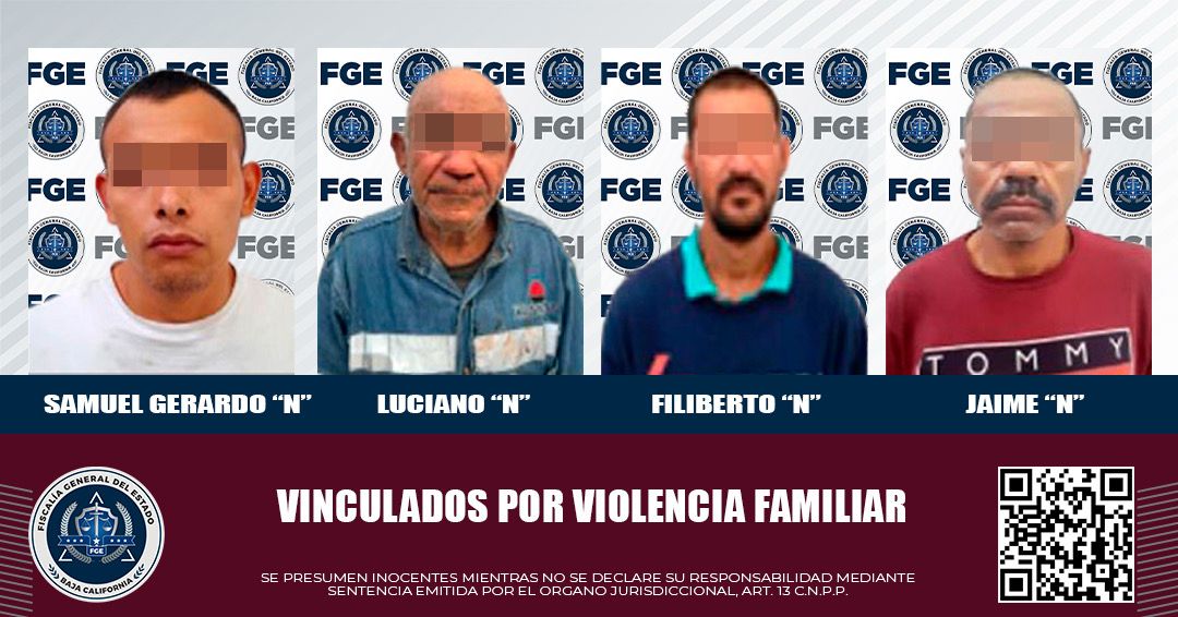 MEXICALI, BAJA CALIFORNIA. - La Fiscalía Regional de Mexicali, a través de la Unidad de Investigación con Detenidos Poniente, obtuvo la vinculación a proceso de cuatro hombres por su presunta responsabilidad en el delito de violencia familiar.