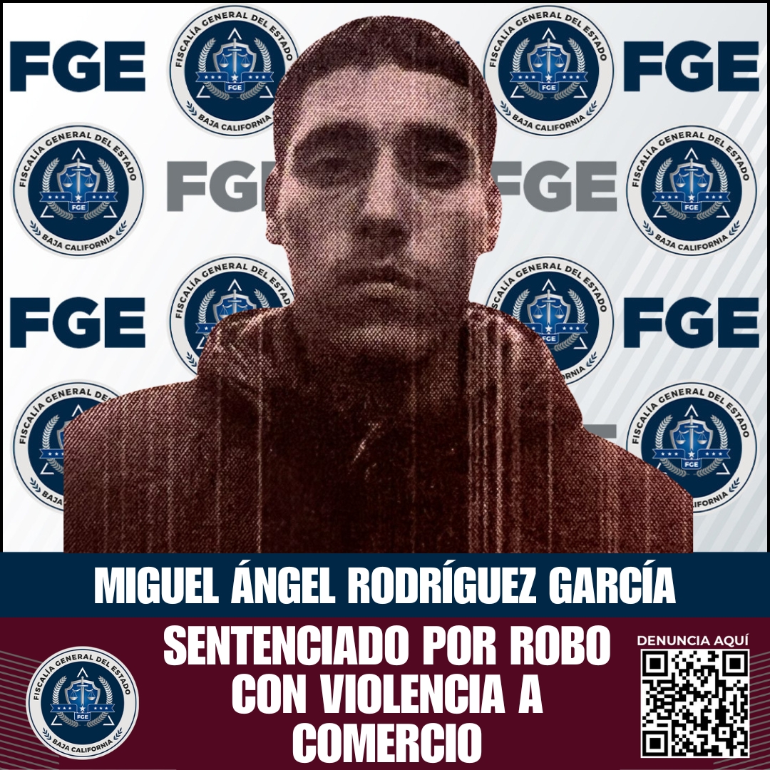 ENSENADA, BAJA CALIFORNIA. - La Fiscalía Regional de Ensenada, a través de la Unidad de Investigación de Robos, obtuvo sentencia condenatoria de 3 años y 8 meses de prisión en contra de Miguel Ángel Rodríguez García, declarado penalmente responsable del delito de robo calificado cometido en establecimiento comercial abierto al público, ejecutado con violencia.