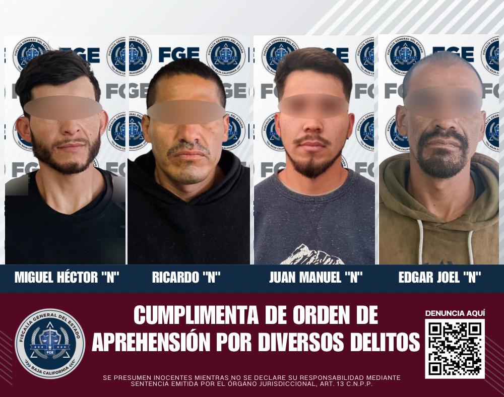 ENSENADA, BAJA CALIFORNIA. - La Fiscalía General del Estado, a través de la Fiscalía Regional de Ensenada y en coordinación con el Grupo Especializado en Aprehensiones, logró la detención de cuatro individuos que contaban con órdenes de aprehensión vigentes por diferentes delitos cometidos en esta ciudad.