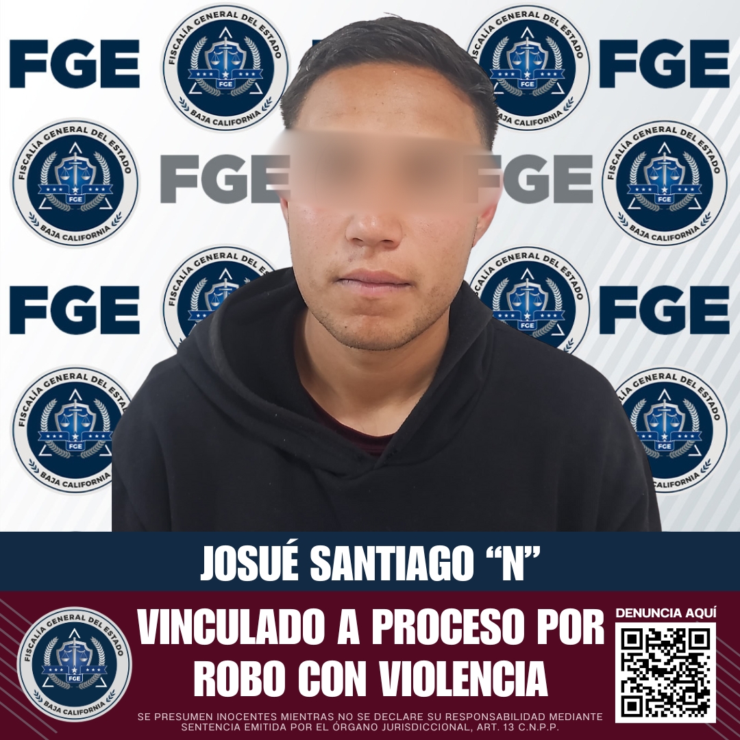 ENSENADA, BAJA CALIFORNIA. - La Fiscalía General del Estado de Baja California, a través de la Unidad de Investigación de Robos, obtuvo la vinculación a proceso de Josué Santiago “N”, por su presunta responsabilidad en el delito de robo calificado cometido en establecimiento comercial abierto al público ejecutado con violencia.