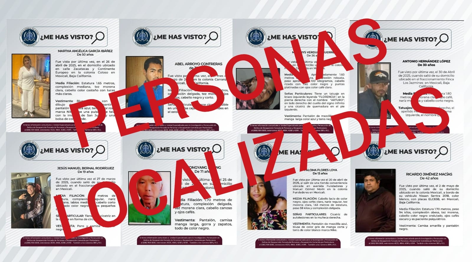 Por lo anterior, se cancelan las pesquisas generadas para la localización de Martha Angélica García Ibáñez de 50 años, Abel Arroyo Contreras de 33; Yongyang Hung de 71; Jesús Manuel Bernal de 19: Merarys Verdugo Guerrero de 26; Antonio Hernández López de 30; Ricardo Jiménez Macías de 42 años, y la menor Paloma Flores Loya de 13.