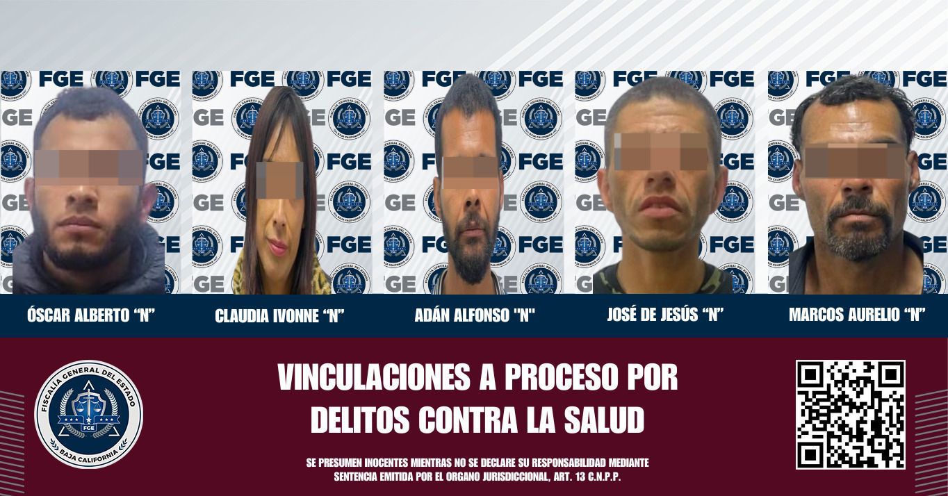 TIJUANA, BAJA CALIFORNIA. - La Fiscalía General del Estado informa que cinco imputados por delitos contra la salud en la modalidad de narcomenudeo han sido vinculados a proceso penal. Esta decisión se tomó después de que los elementos de prueba presentados por el Ministerio Público fueran suficientes para que los jueces de control determinaran iniciar procesos en su contra.