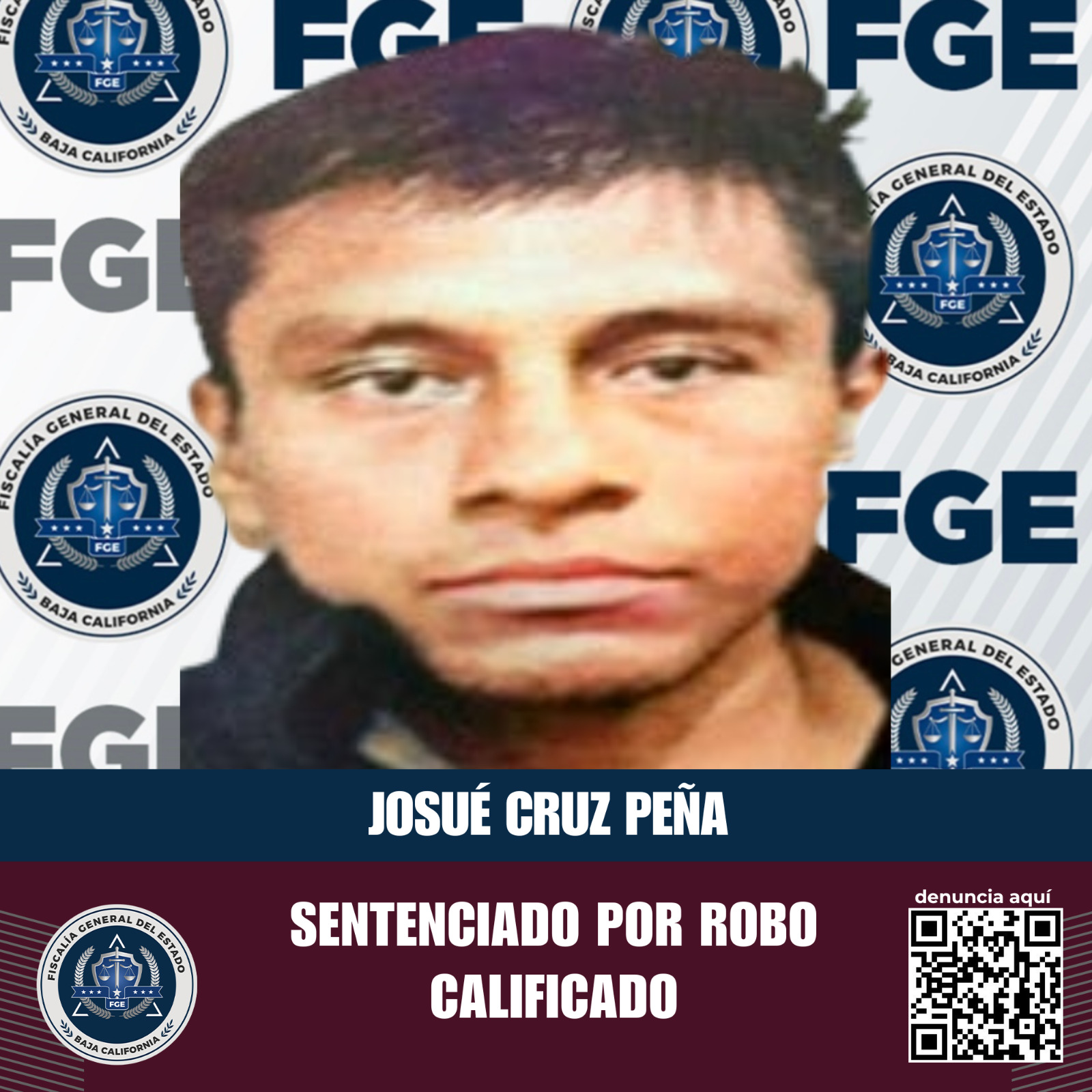 TIJUANA, BAJA CALIFORNIA. - La Fiscalía General del Estado (FGE), a través de la Fiscalía Regional de Tijuana y su Unidad de Investigación de Robos Centro, informa sobre la obtención de una sentencia condenatoria de 3 años y 8 meses de prisión en contra de Josué Cruz Peña, por su responsabilidad en el delito de Robo Calificado cuando se comete en Establecimiento Comercial Abierto al Público.