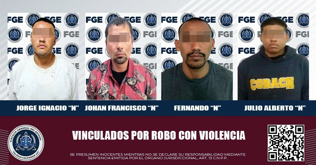 MEXICALI, BAJA CALIFORNIA. - La Fiscalía Regional de Mexicali obtuvo la vinculación a proceso de cuatro hombres, acusados de diversos delitos de robo, durante audiencias celebradas por separado ante el Juez de Control.
