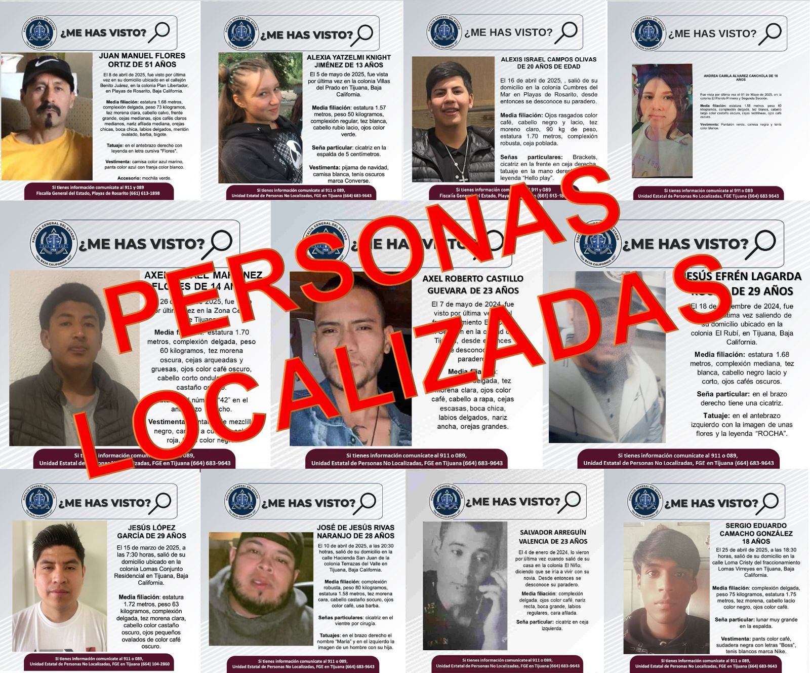 TIJUANA, BAJA CALIFORNIA. - La Fiscalía General del Estado (FGE) informa de la localización de once personas que habían sido reportadas como desaparecidas, tres de ellas menores de edad. Este grupo, compuesto por dos mujeres y nueve hombres, fue localizado en condiciones óptimas de salud.