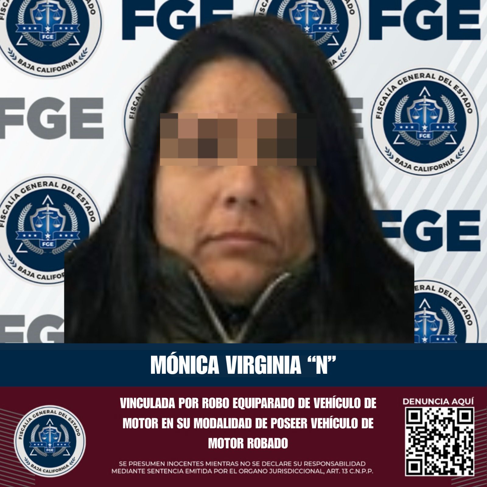 TECATE, BAJA CALIFORNIA. - La Fiscalía Regional de Tecate obtuvo la vinculación a proceso de Mónica Virginia “N”, acusada del delito de robo equiparado de vehículo de motor, en su modalidad de posesión de vehículo de motor robado.