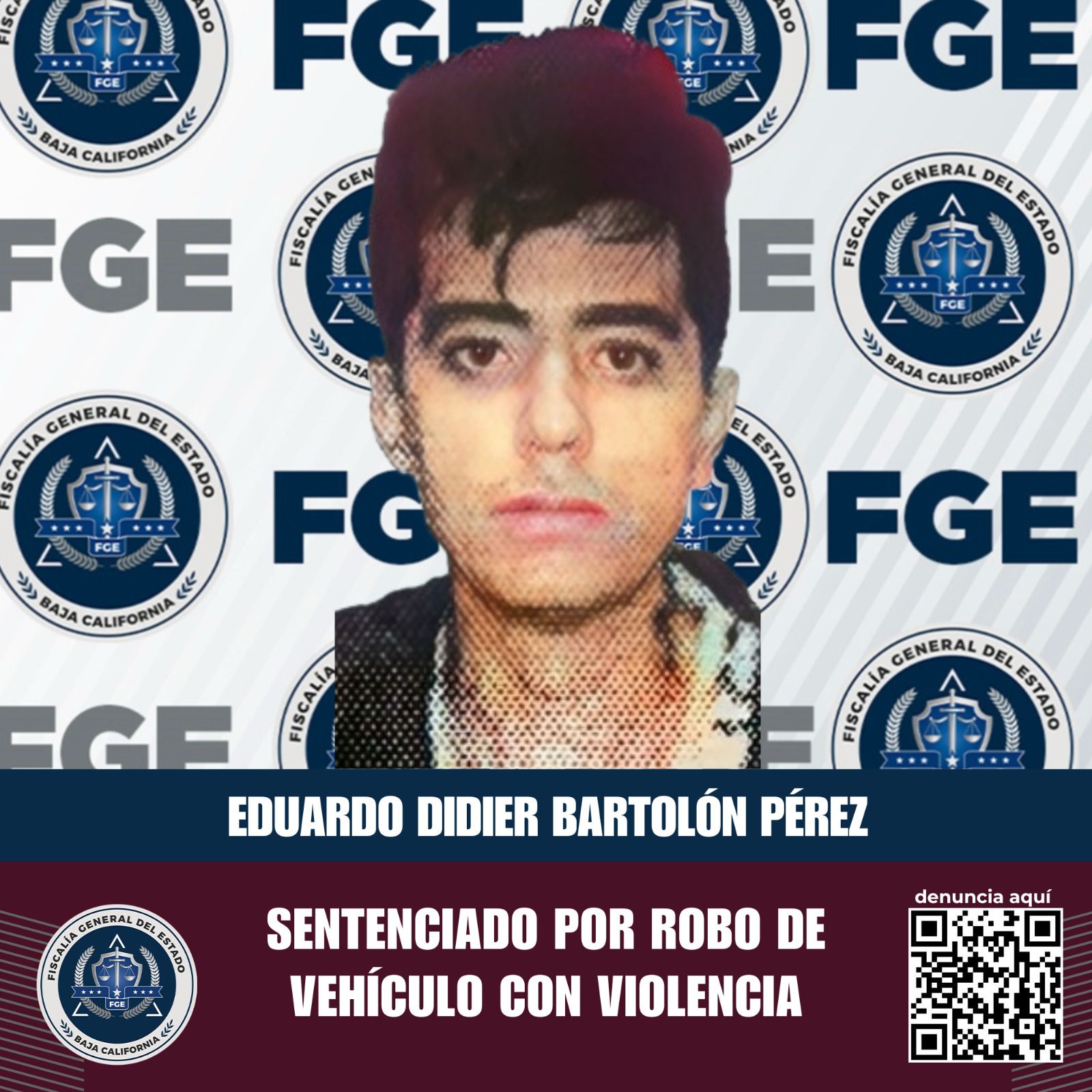 TIJUANA, BAJA CALIFORNIA. - La Unidad de Investigación de Robo de Vehículos, adscrita a la Fiscalía Regional de Tijuana, dio a conocer que se logró obtener una sentencia condenatoria en contra de Eduardo Didier Bartolón Pérez, a quien le dictaron sentencia de 6 años en prisión, así como el pago de una multa y la reparación del daño en favor de la víctima, por el delito de robo de vehículo con violencia.
