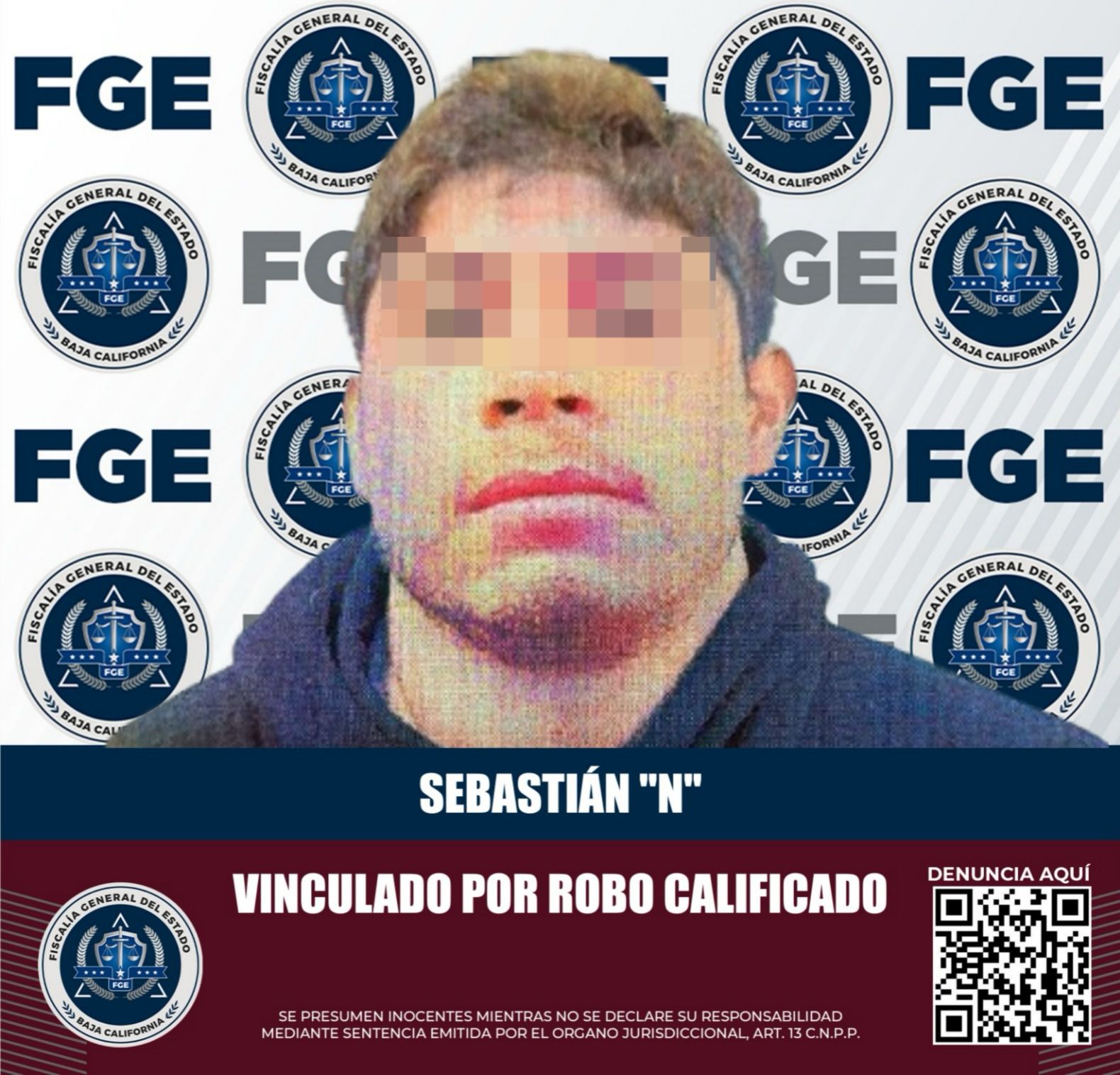 TIJUANA, BAJA CALIFORNIA. - La Unidad de Investigación de Robos Mariano Matamoros, adscrita a la Fiscalía Regional de Tijuana, presentó datos de prueba contundentes ante la autoridad judicial, en contra de Sebastián “N”, a quien se le señala por el delito de robo calificado, cuando se cometa en establecimiento comercial, abierto al público ejecutado con violencia.