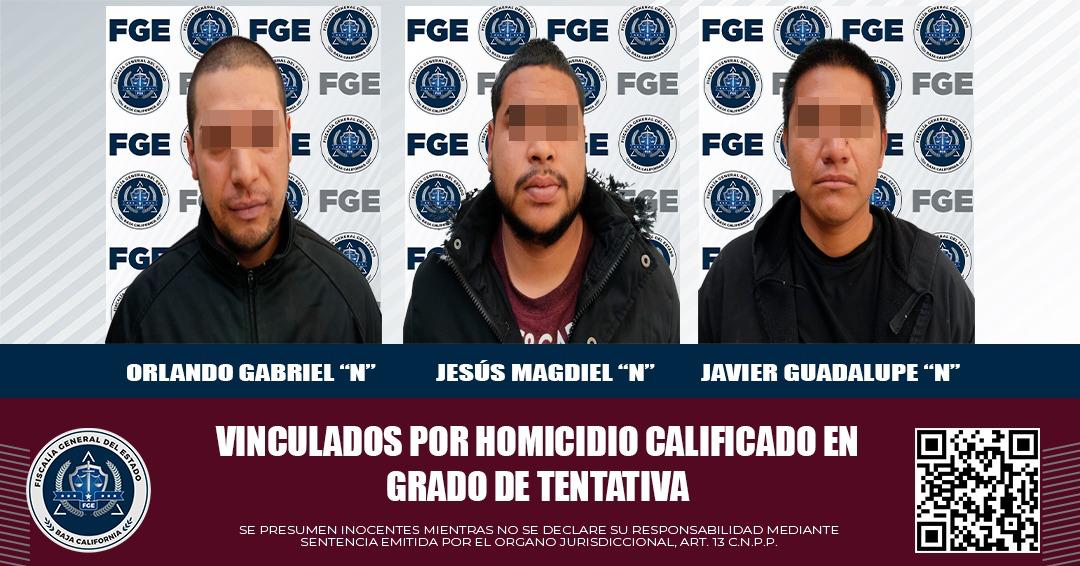 MEXICALI, BAJA CALIFORNIA. - La Fiscalía Regional de Mexicali, a través de la Unidad de Investigación con Detenidos Poniente, obtuvo la vinculación a proceso de tres hombres por su presunta participación en el delito de homicidio calificado por ventaja en grado de tentativa, en hechos ocurridos la madrugada del 28 de abril del presente año.