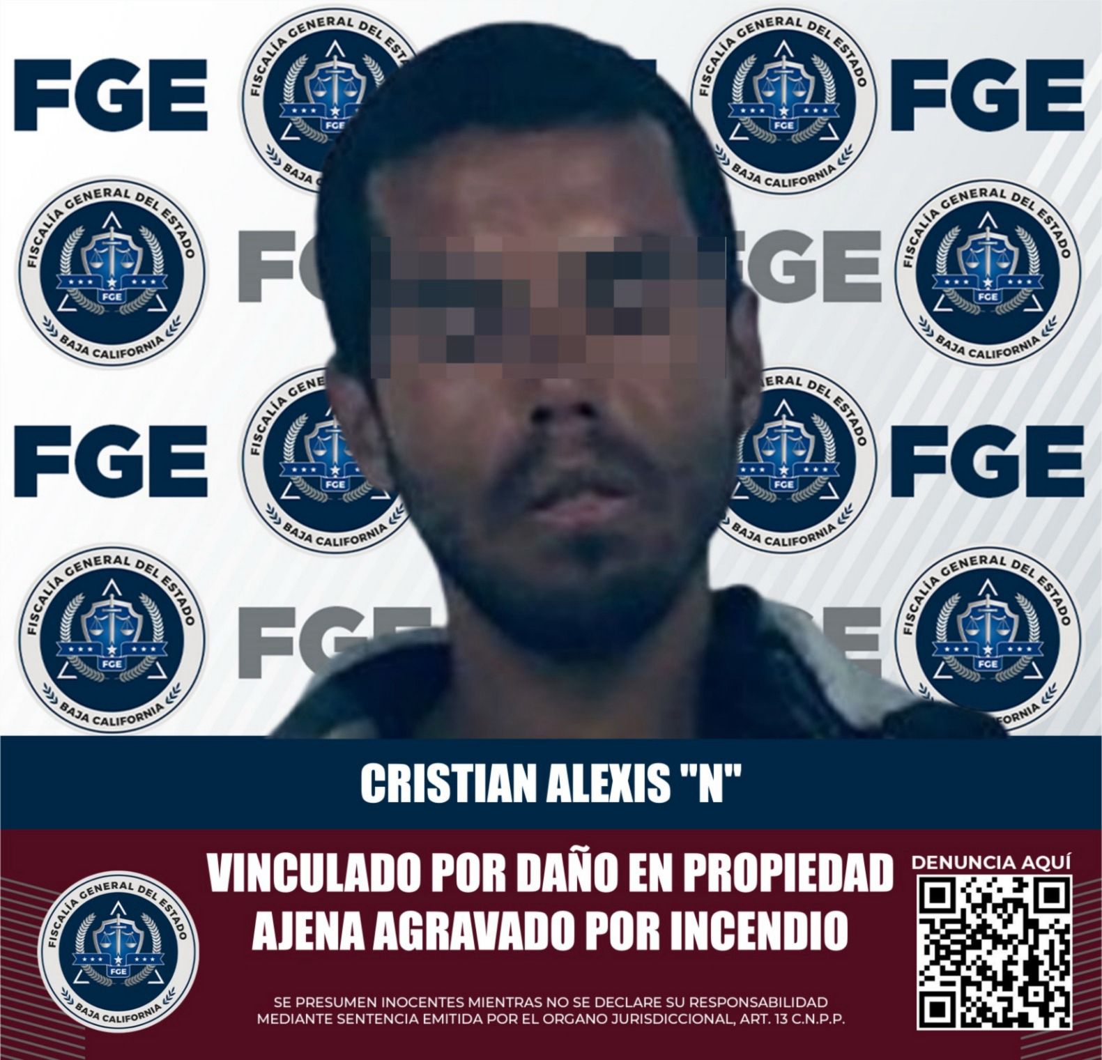 TECATE, BAJA CALIFORNIA. - La Unidad de Investigación con Detenido, adscrita a la Fiscalía Regional de Tecate, logró recabar suficientes datos de prueba contundentes en contra de Cristian Alexis “N”, por el delito de daño en propiedad ajena agravado por incendio.