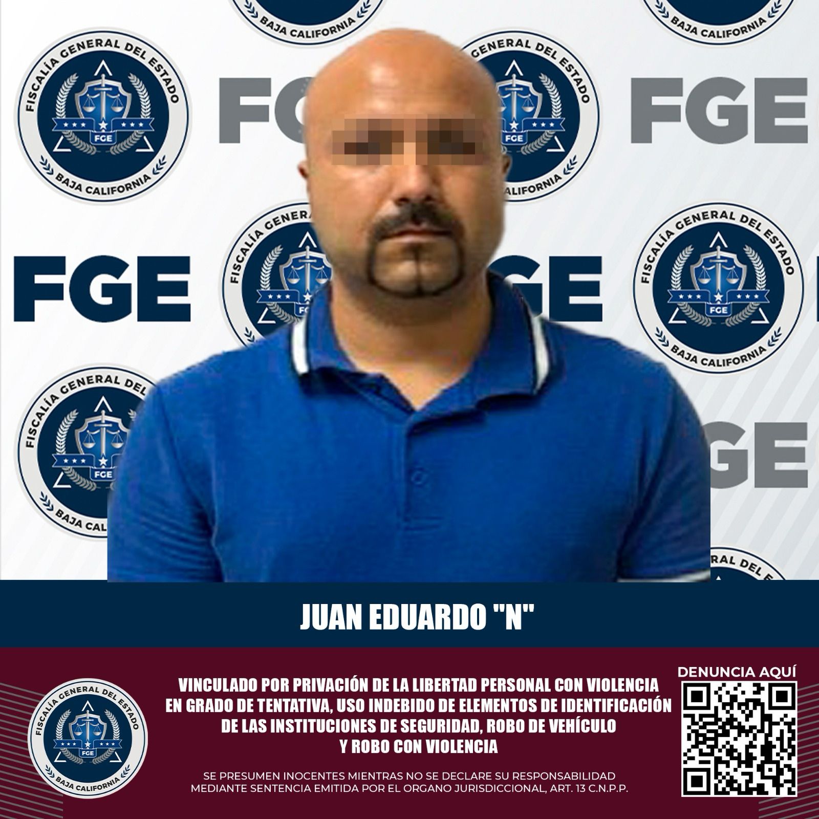 MEXICALI, BAJA CALIFORNIA. - Como resultado del trabajo realizado por la Fiscalía Regional de Mexicali, un individuo presuntamente involucrado en los delitos de privación de la libertad personal con violencia en grado de tentativa, uso indebido de elementos de identificación de las Instituciones de seguridad, robo con violencia y robo de vehículo, fue vinculado a proceso con la medida cautelar de prisión preventiva.