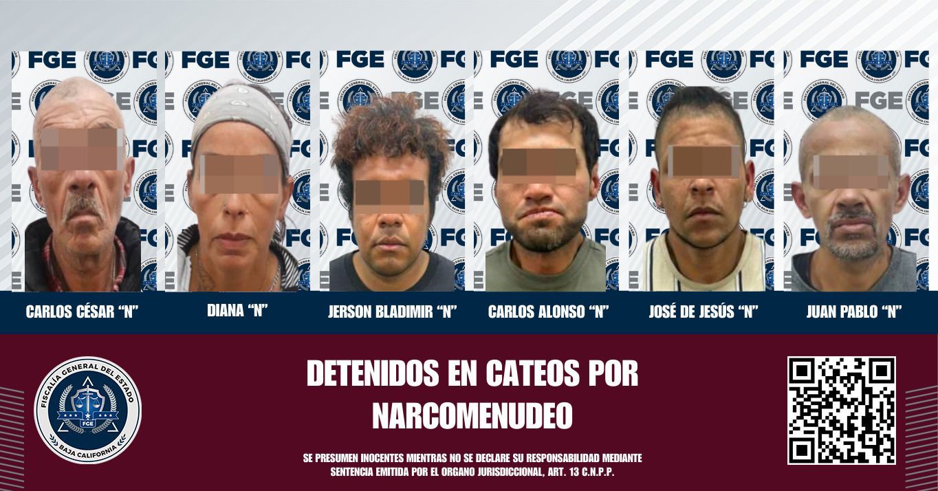 TIJUANA, BAJA CALIFORNIA. - Con la convicción de continuar enfrentando el delito de compra y venta de droga al menudeo, la Fiscalía General del Estado, a través de la Fiscalía Especializada en Narcomenudeo, detuvo a seis personas en tres cateos ordenados por jueces estatales.