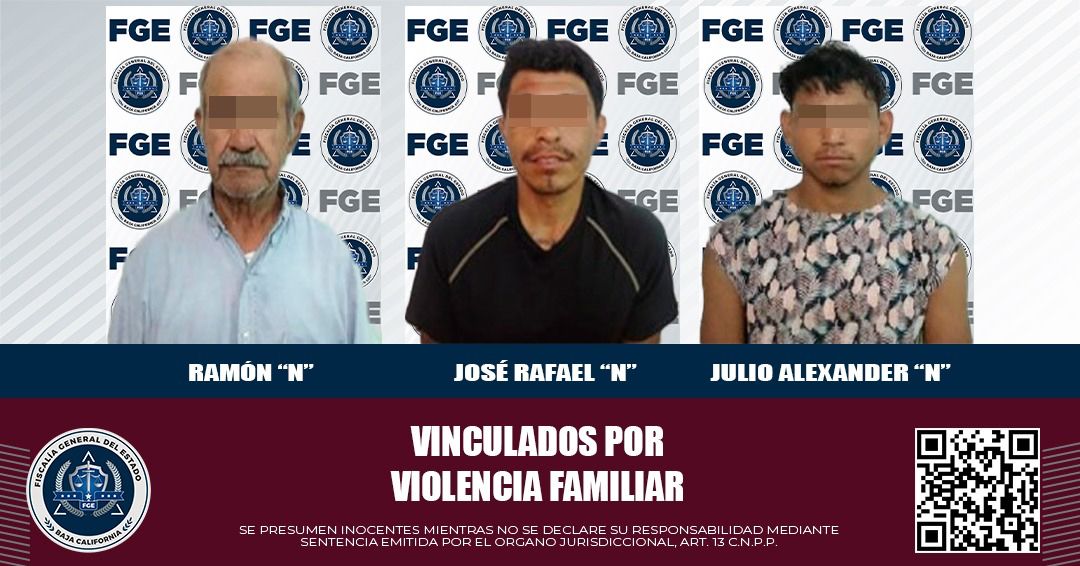 MEXICALI, BAJA CALIFORNIA. - La Fiscalía Regional de Mexicali, en coordinación con la Unidad de Investigación de Delitos con Detenidos Oriente, obtuvo la vinculación a proceso de tres hombres por el delito de violencia familiar.