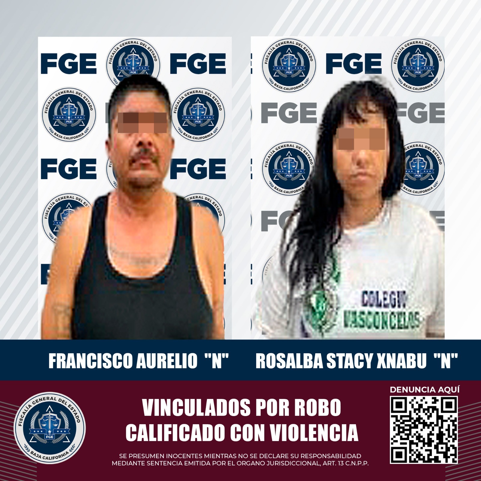 MEXICALI, BAJA CALIFORNIA. - La Fiscalía Regional de Mexicali, a través de la Unidad de Investigación de Delitos con Detenidos Poniente, obtuvo la vinculación a proceso de los imputados Francisco Aurelio “N” y Rosalba Stacy Xnabu “N”, por el delito de robo calificado con violencia.