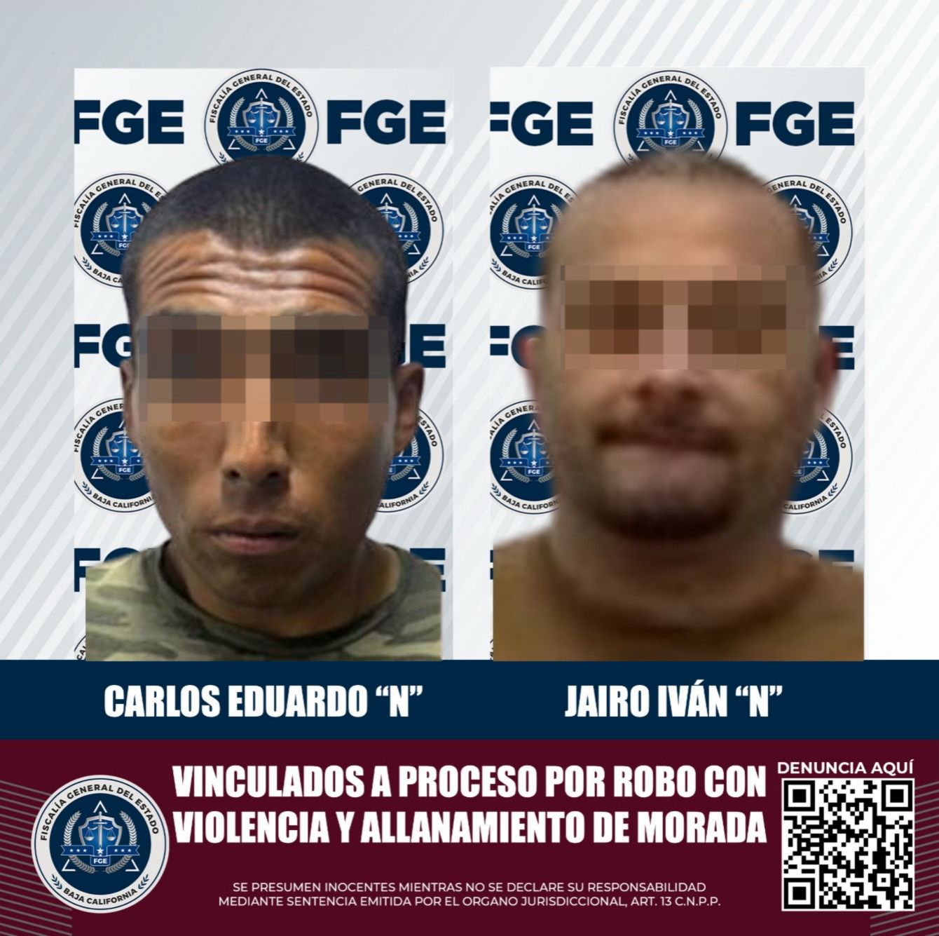 TIJUANA, BAJA CALIFORNIA. - La Fiscalía General del Estado, a través del Ministerio Público de la Unidad de Investigación con Detenido de la Fiscalía Regional de Tijuana, logró que, con los datos de prueba presentados ante un Juez de Control, se decretara prisión preventiva para dos sujetos implicados en los delitos de robo con violencia y allanamiento de morada, en distintos casos.