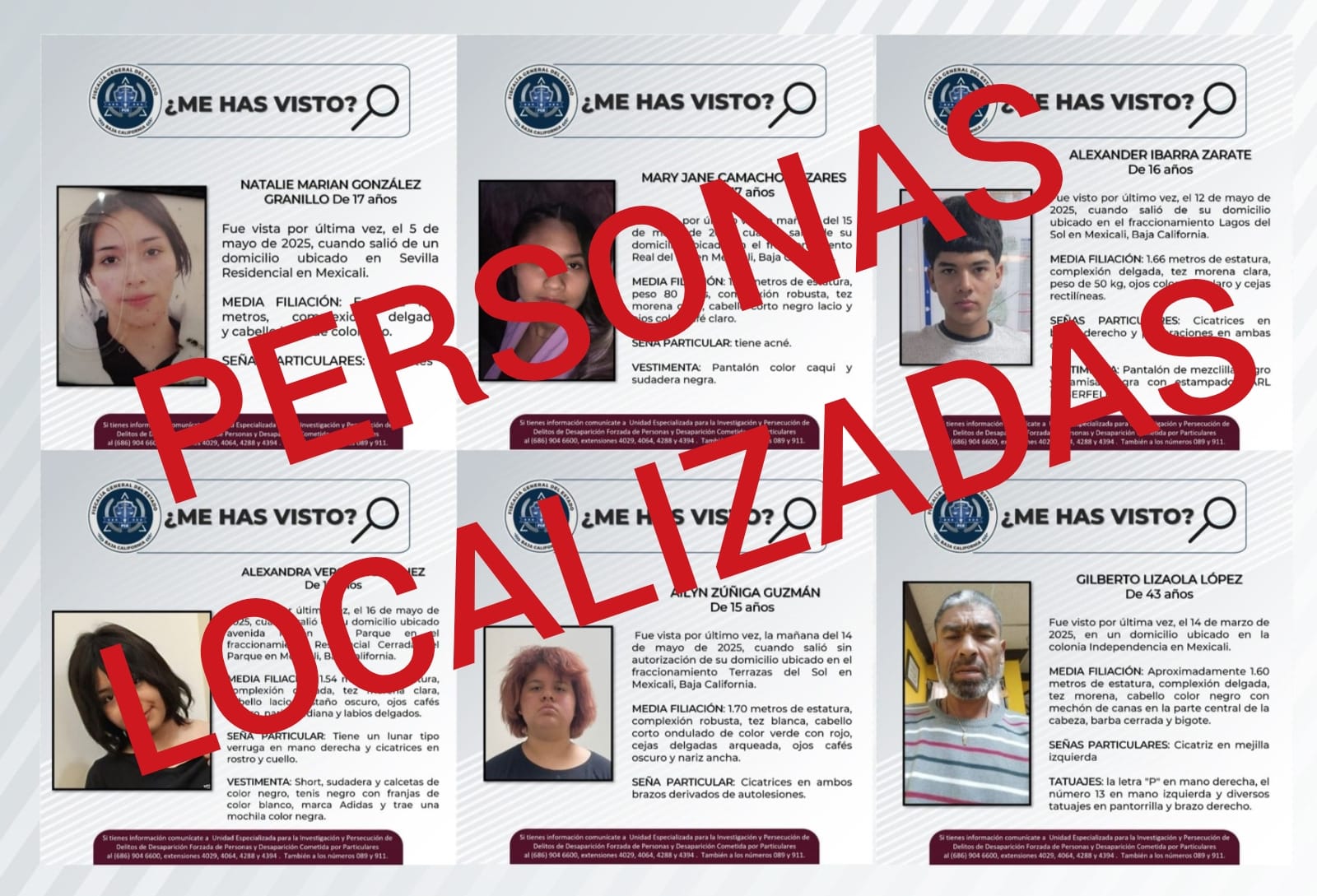 MEXICALI, BAJA CALIFORNIA - La Fiscalía General del Estado de Baja California, a través de la Unidad Especializada para la Investigación y Persecución de Delitos de Desaparición Forzada y Desaparición Cometida por Particulares, localizó a seis personas que contaban con reporte de búsqueda.