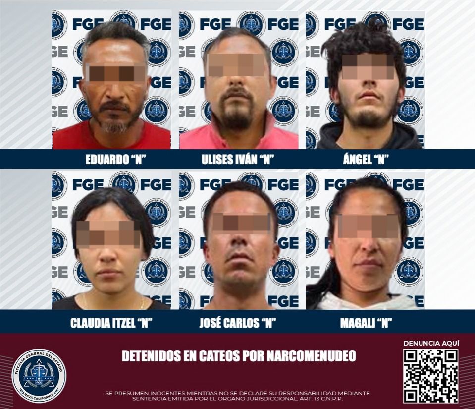 TIJUANA, BAJA CALIFORNIA. - La Fiscalía General del Estado, a través de la Fiscalía Especializada en Narcomenudeo, en acciones coordinadas para combatir el delito de compra y venta de droga al menudeo, detuvo a seis personas en el marco de cuatro cateos ordenados por jueces estatales.