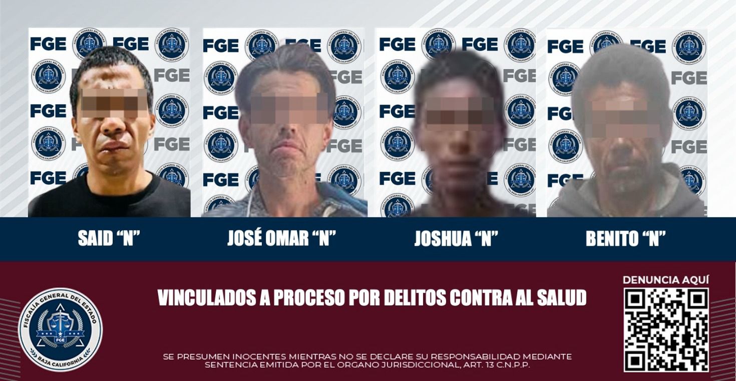 TIJUANA, BAJA CALIFORNIA. - La Fiscalía General del Estado informa que cuatro personas imputadas por delitos contra la salud fueron vinculadas a proceso penal, como resultado de los elementos de prueba presentados por el Ministerio Público de la Fiscalía Especializada en Narcomenudeo.