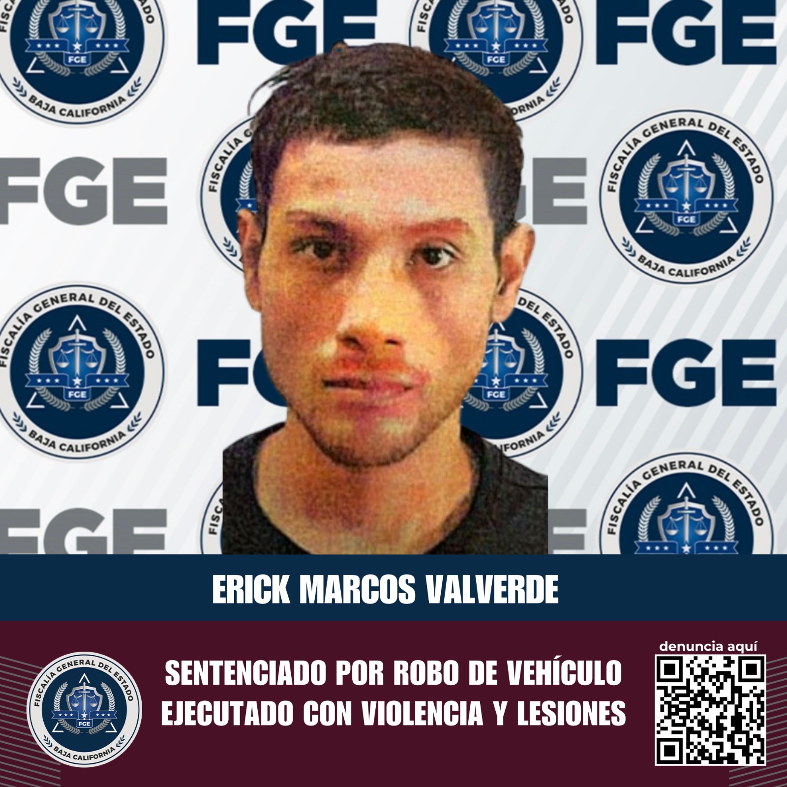 TIJUANA, BAJA CALIFORNIA. - La Fiscalía General del Estado, a través de la Unidad de Investigación de Robo de Vehículos Zona Tijuana, obtuvo una sentencia condenatoria en contra de Erick Marcos Valverde, por su responsabilidad en la comisión del delito de robo de vehículo ejecutado con violencia y lesiones.