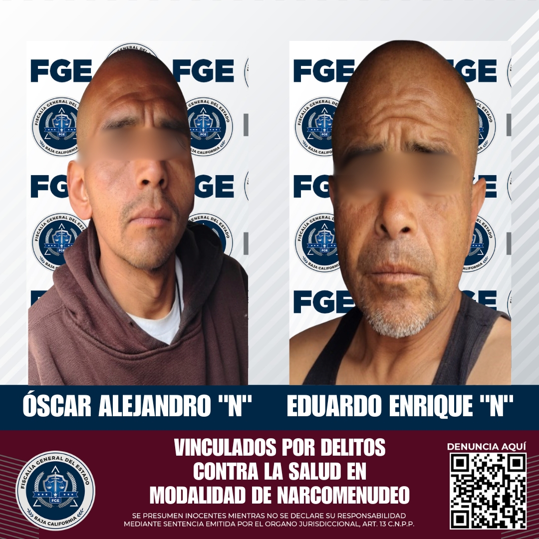 ENSENADA, BAJA CALIFORNIA. - La Fiscalía General del Estado, a través de la Fiscalía Especializada en Narcomenudeo, obtuvo la vinculación a proceso de Óscar Alejandro “N” y Eduardo Enrique “N” por delitos contra la salud, en su modalidad de narcomenudeo.