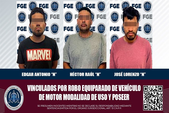 MEXICALI, BAJA CALIFORNIA. - La Fiscalía Regional de Mexicali, a través de la Unidad de Investigación de Delitos de Robo de Veh ículos, obtuvo la vinculación a proceso de tres individuos por su presunta participación en el delito de robo equiparado de vehículo de motor, en la modalidad de uso y posesión.