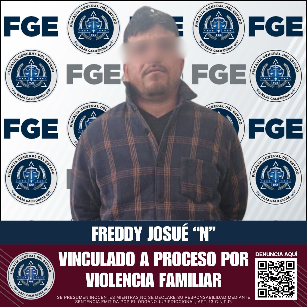 ENSENADA, BAJA CALIFORNIA. - La Fiscalía Regional de Ensenada, la Unidad de Investigación de Maneadero, informa que se obtuvo la vinculación a proceso de Freddy Josué “N” por su probable responsabilidad en el delito de violencia familiar equiparada, derivado de hechos ocurridos en noviembre de 2023.