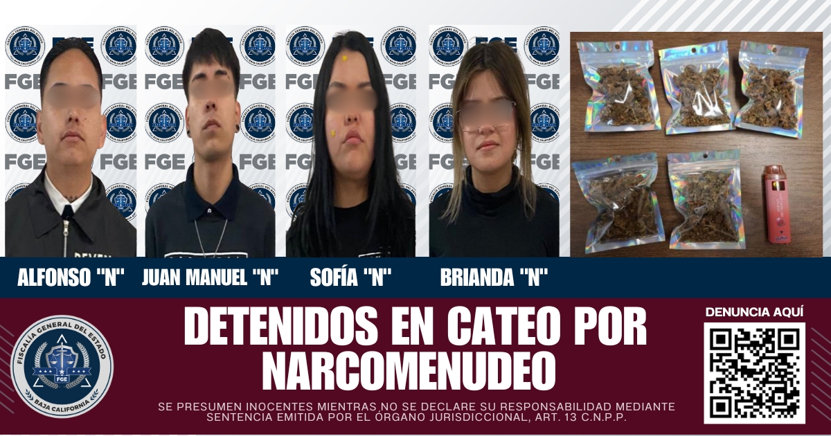 Como resultado del operativo, fueron detenidos Alfonso “N”, Juan Manuel “N”, Sofía “N” y Brianda “N”, quienes fueron encontrados en posesión de cinco bolsas grandes de plástico con cierre hermético que contenían marihuana, así como un cigarro electrónico. Además, el inmueble fue asegurado como parte del proceso de investigación.