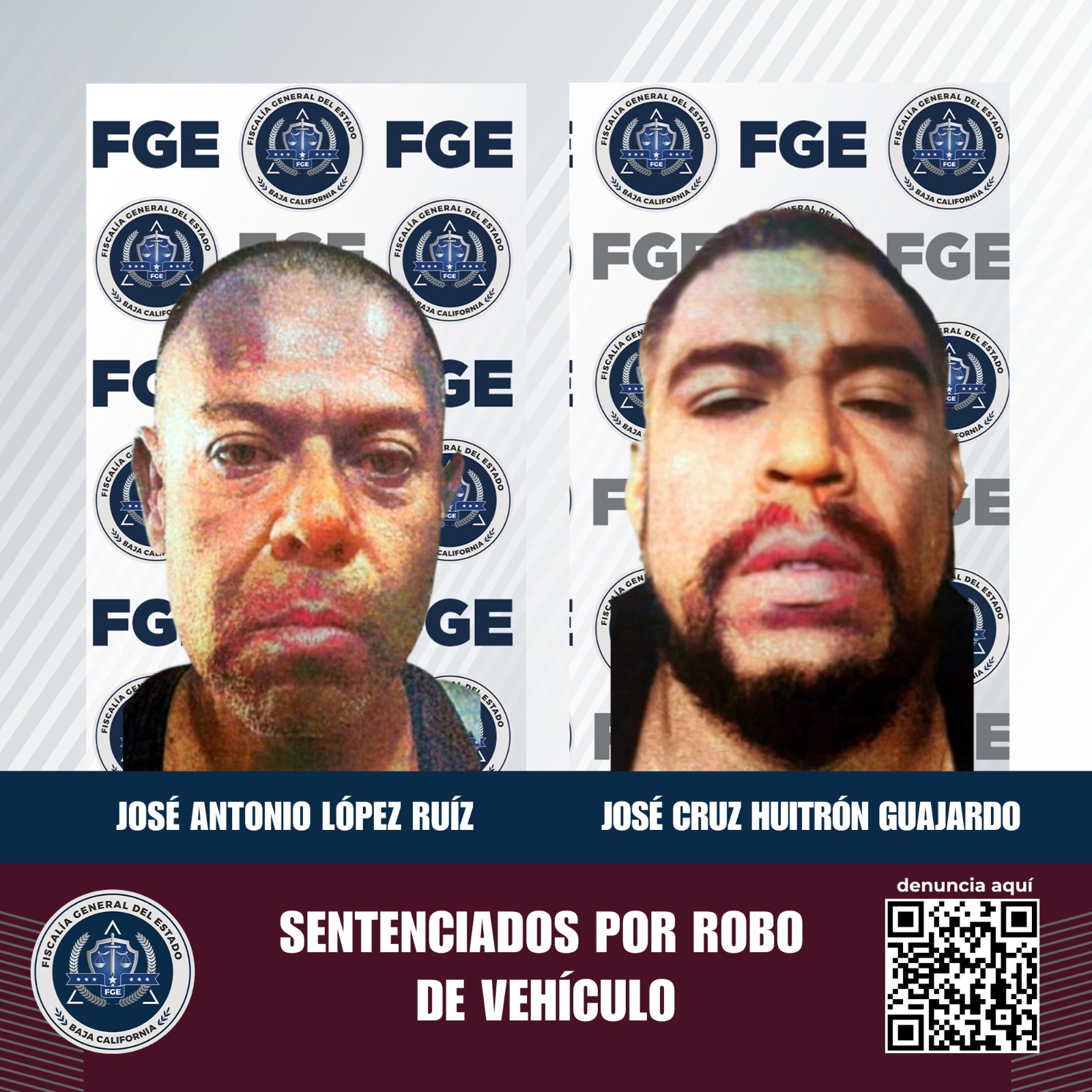 TIJUANA, BAJA CALIFORNIA. - La Fiscalía Regional de Tijuana, a través del trabajo de la Unidad de Investigación de Robo de Vehículos, logró obtener dos sentencias condenatorias en contra de José Antonio López Ruíz y José Cruz Huitrón Guajardo, quienes en acciones por separado fueron detenidos y presentados ante la autoridad por el delito de robo equiparado de vehículo de motor robado.