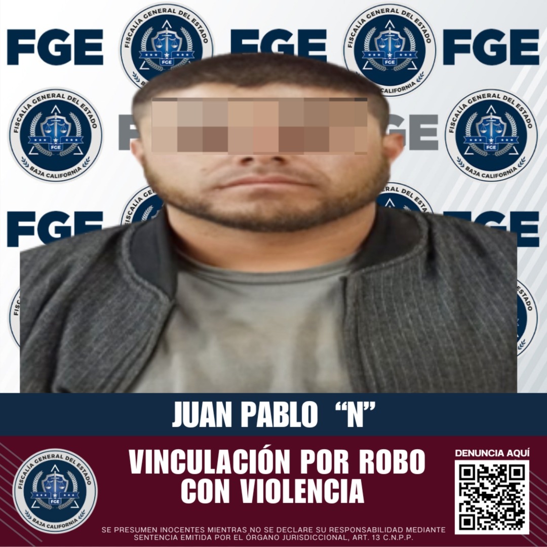 ENSENADA, BAJA CALIFORNIA. - La Fiscalía Regional de Ensenada obtuvo la vinculación a proceso de Juan Pablo “N”, por su probable responsabilidad en el delito de robo con violencia cometido en establecimiento comercial, en hechos ocurridos recientemente en la colonia Pórticos del Mar.