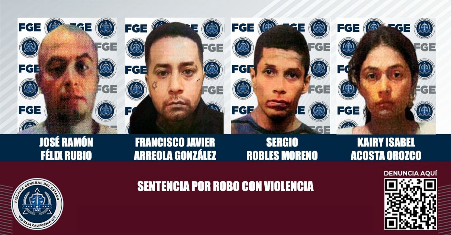 TIJUANA, BAJA CALIFORNIA. - La Fiscalía General del Estado, con base en las pruebas presentadas por el Ministerio Público, obtuvo una sentencia de siete años y cuatro meses de prisión para tres hombres y una mujer responsables del delito de robo con violencia, perpetrado por dos o más personas.