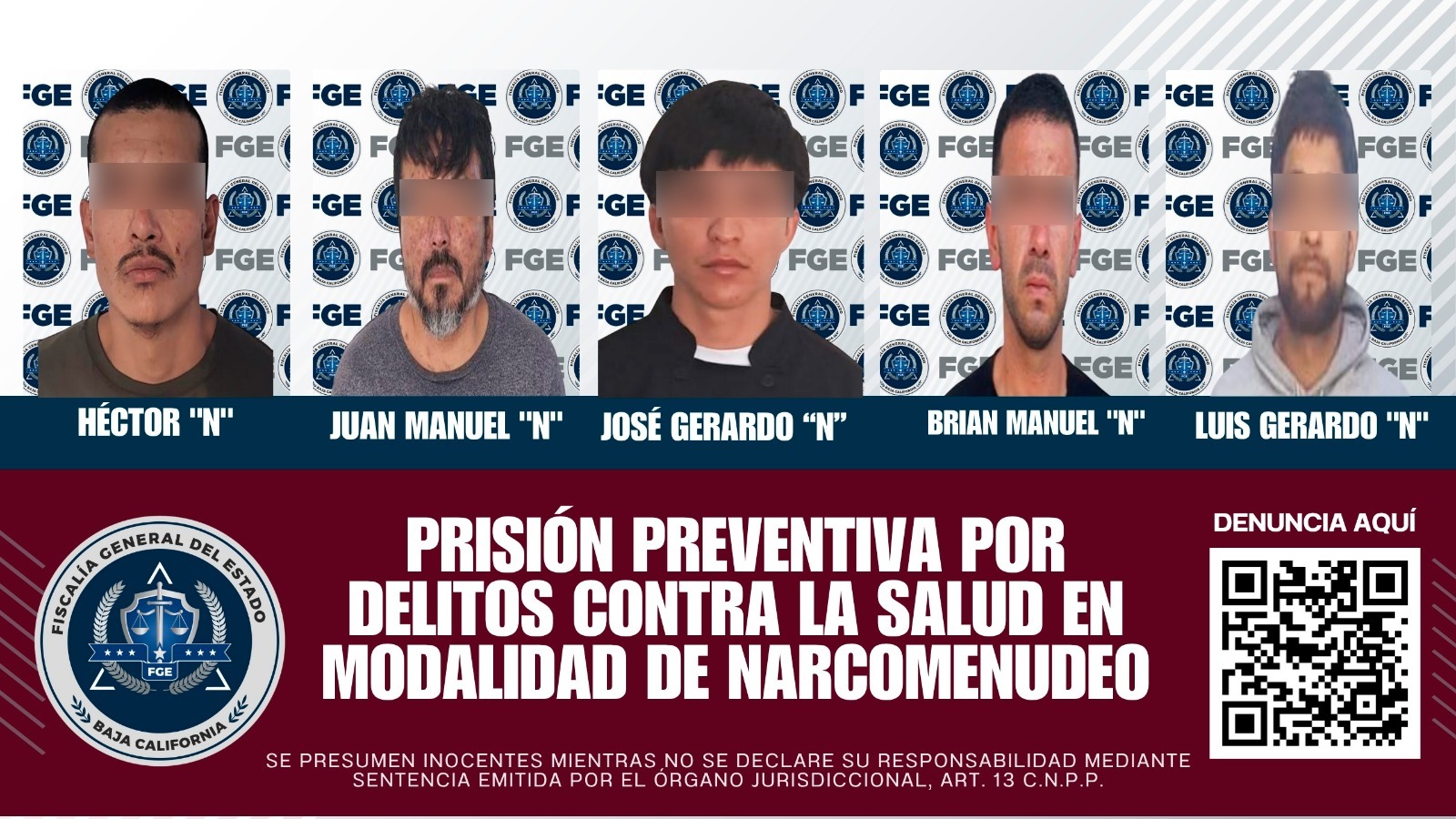 ENSENADA, BAJA CALIFORNIA. - La Fiscalía General del Estado (FGE), a través de la Fiscalía Especializada en Narcomenudeo, obtuvo la vinculación a proceso de cinco individuos por delitos contra la salud, tras ser sorprendidos en posesión de diversas sustancias ilícitas en la ciudad de Ensenada.