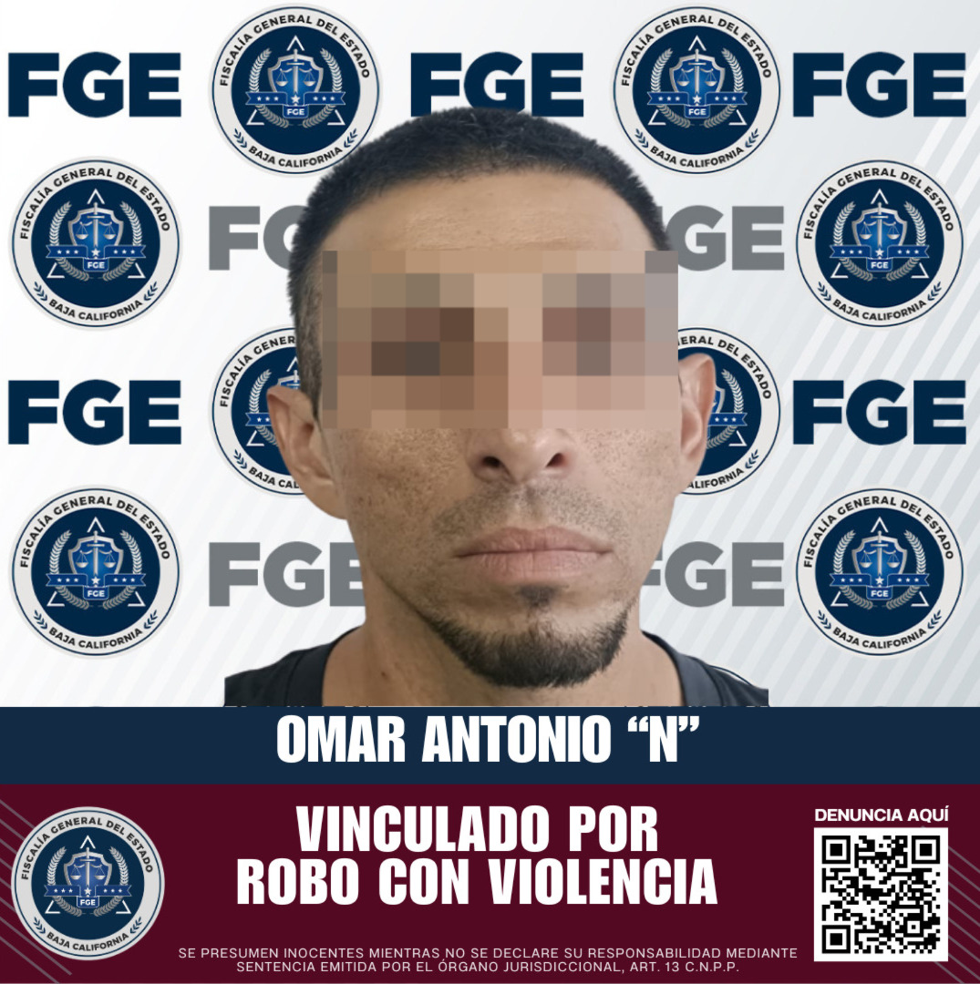 ENSENADA, BAJA CALIFORNIA. - La Fiscalía Regional de Ensenada, a través de la Unidad de Investigación de Robos, obtuvo la vinculación a proceso y la imposición de medida cautelar de prisión preventiva justificada contra Omar Antonio “N”, de 32 años, por su presunta participación en un robo con violencia a un establecimiento comercial.