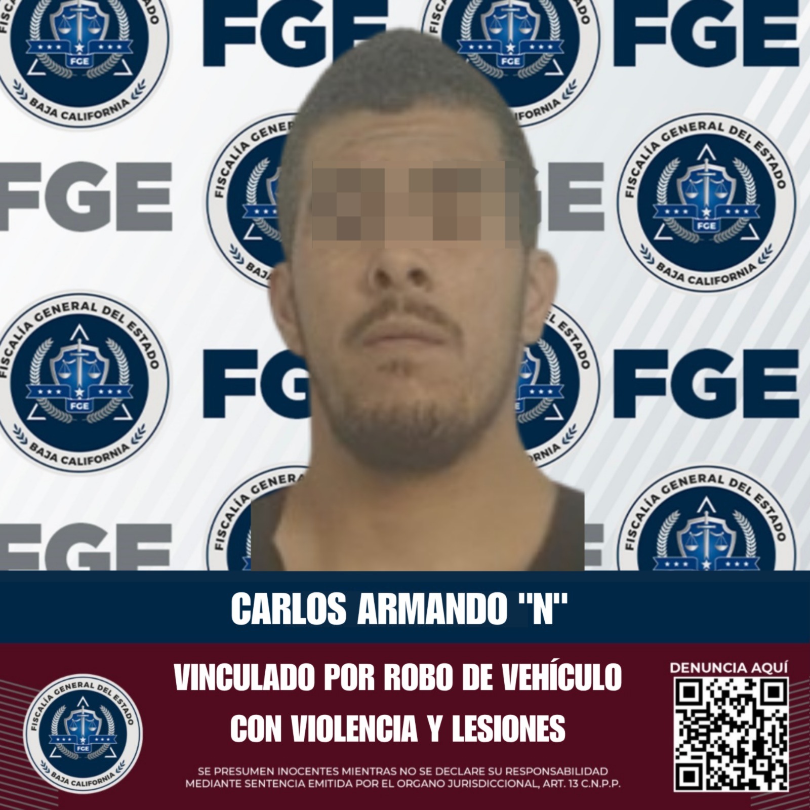 TIJUANA, BAJA CALIFORNIA. - La Fiscalía Regional de Tijuana, a través de la Unidad de Investigación de Robo de Vehículos, informó que se logró obtener la vinculación a proceso de Carlos Armando “N” por los delitos de robo de vehículo con violencia y lesiones calificadas.