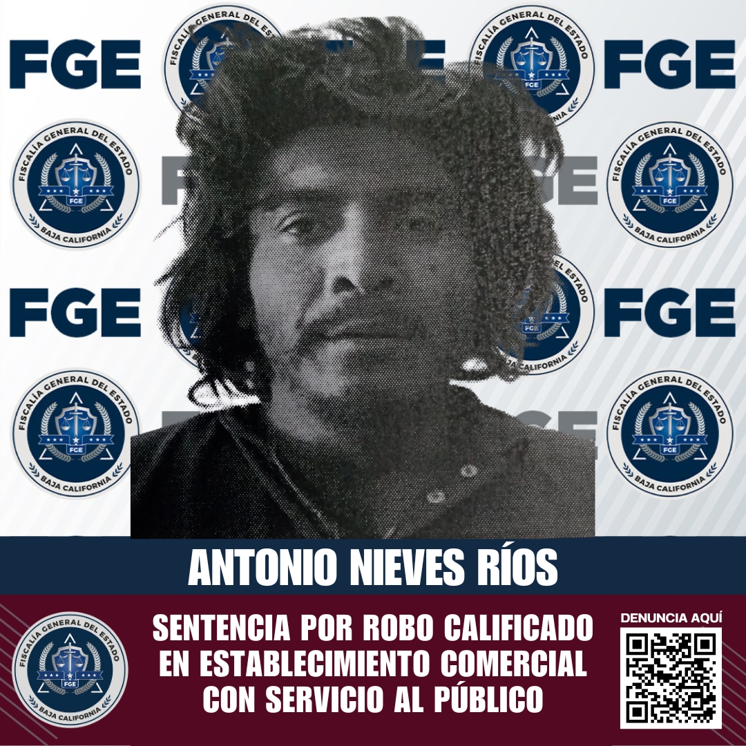 ENSENADA, BAJA CALIFORNIA. - La Fiscalía Regional de Ensenada, a través de la Unidad de Investigación de Delitos de Robo, realizó una investigación que permitió determinar la responsabilidad de Antonio Nieves Ríos en el delito de robo calificado, cometido en un establecimiento con servicio al público.