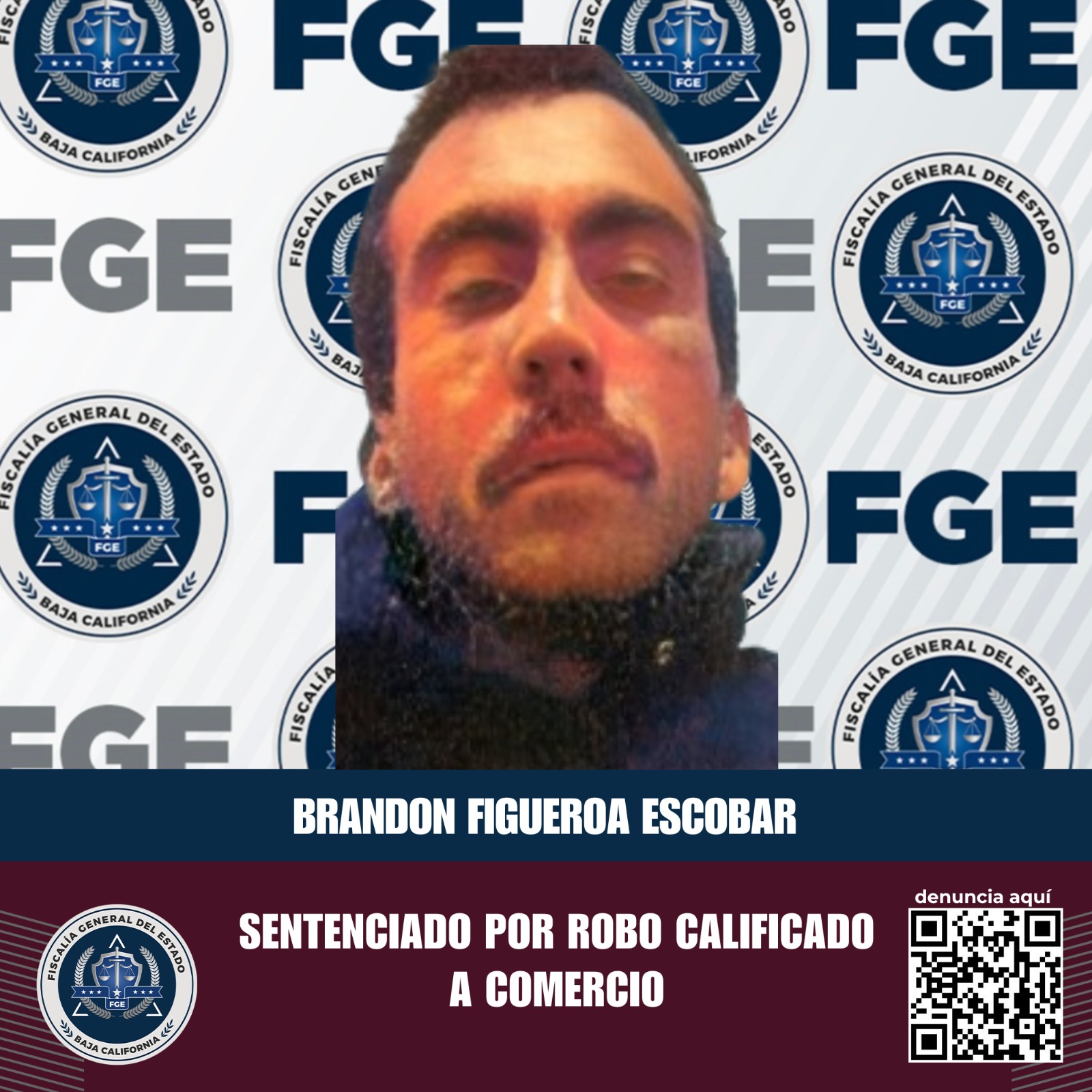 TIJUANA, BAJA CALIFORNIA. - La Fiscalía Regional de Tijuana, con el trabajo de la Unidad de Investigación de Robos Zona La Mesa, informa que se logró obtener una sentencia condenatoria en contra de Brandon Figueroa Escobar, alias “Brandon Nieblas Zavala”, por el delito de robo calificado cometido en comercio abierto al público, gracias a la presentación de pruebas contundentes por parte del Ministerio Público.