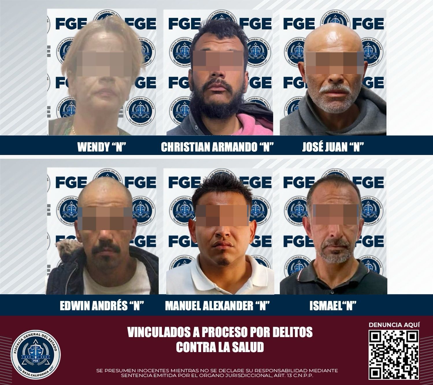 TIJUANA, BAJA CALIFORNIA. - La Fiscalía General del Estado informa que seis personas han sido vinculadas a proceso por delitos contra la salud, tras su detención en posesión de diversas cantidades de drogas en diferentes incidentes.
