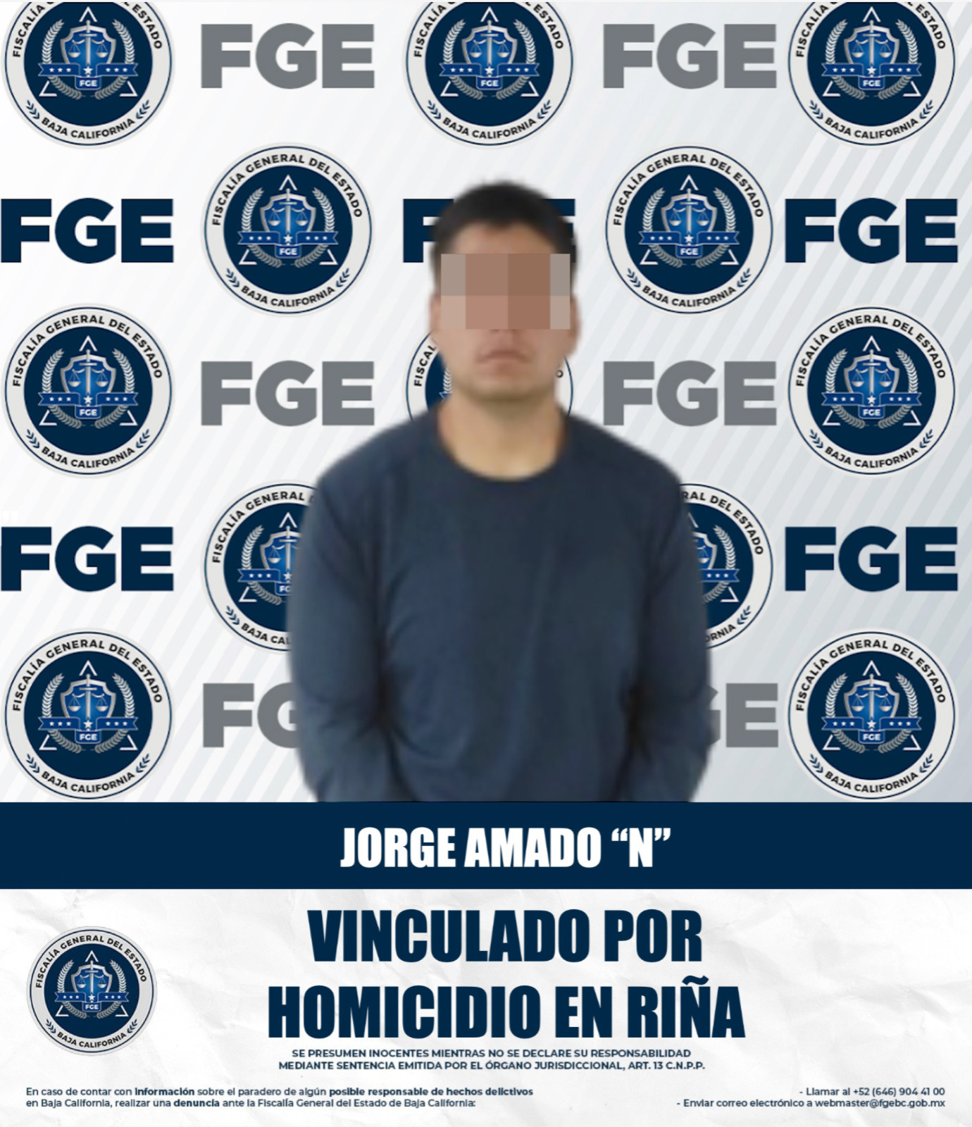 ENSENADA, BAJA CALIFORNIA. - La Fiscalía General del Estado, a través de la Fiscalía Especializada en Delitos Contra la Vida, informa que se obtuvo auto de vinculación a proceso y la imposición de la medida cautelar de prisión preventiva justificada en contra de Jorge Amado “N”, por su presunta responsabilidad en el delito de homicidio en riña.
