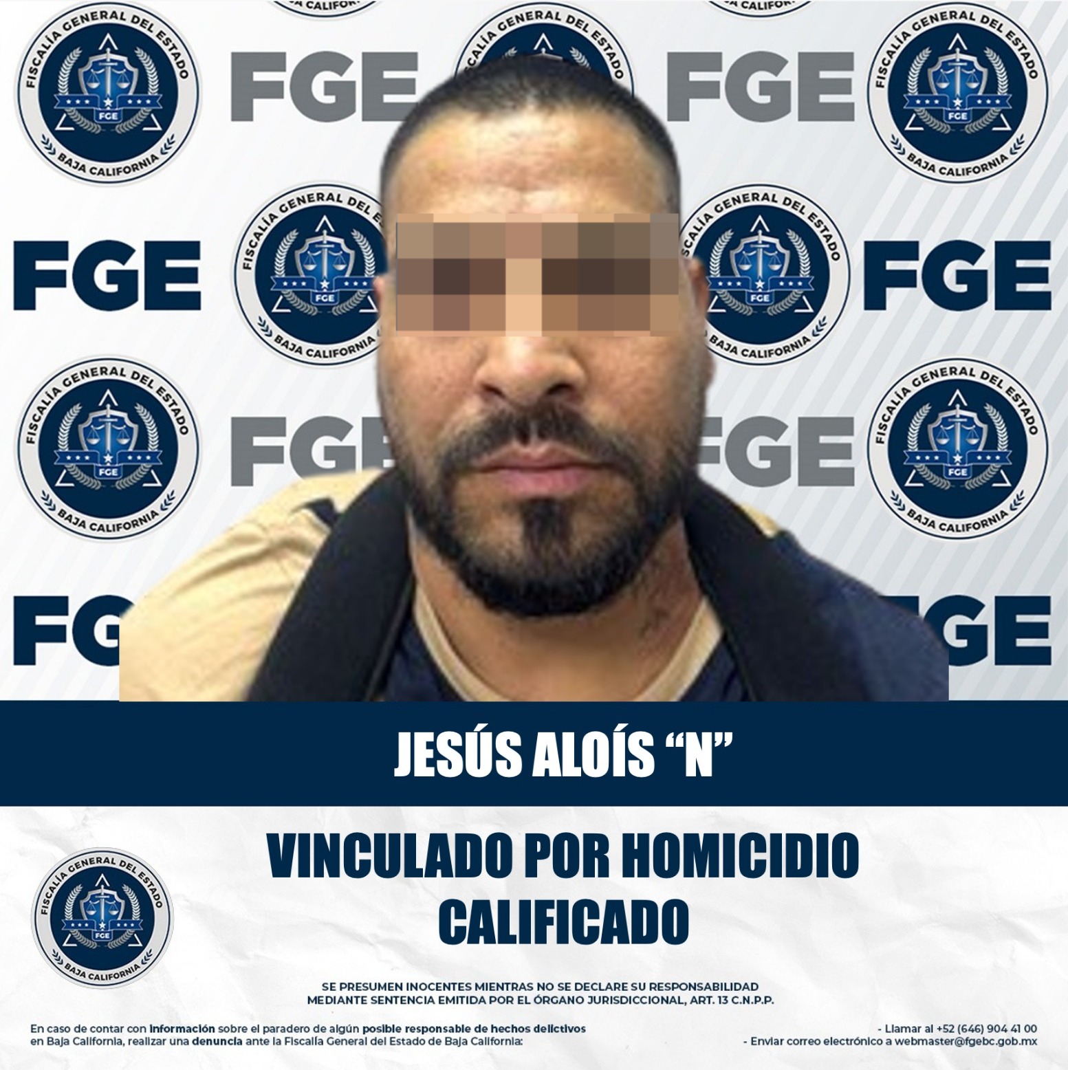 MEXICALI BAJA CALIFORNIA. - La Fiscalía General del Estado, a través de la Fiscalía Especializada en Delitos contra la Vida, logró la vinculación a proceso de Jesús Aloís “N”, relacionado en la muerte de tres hombres registrada en enero de 2024.