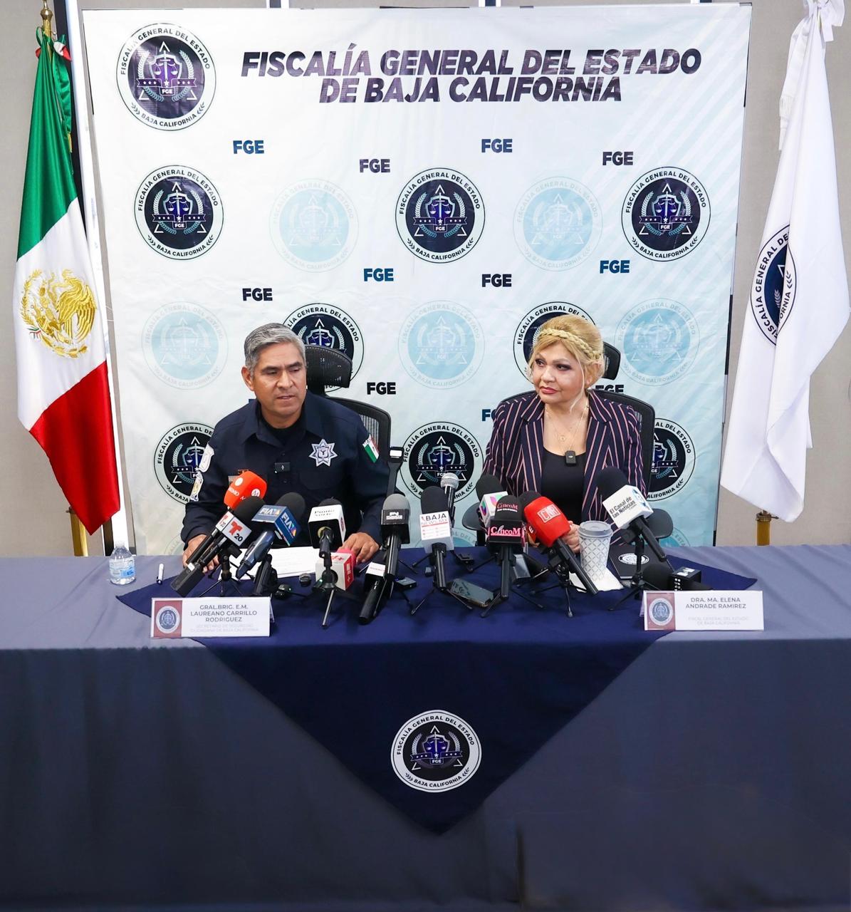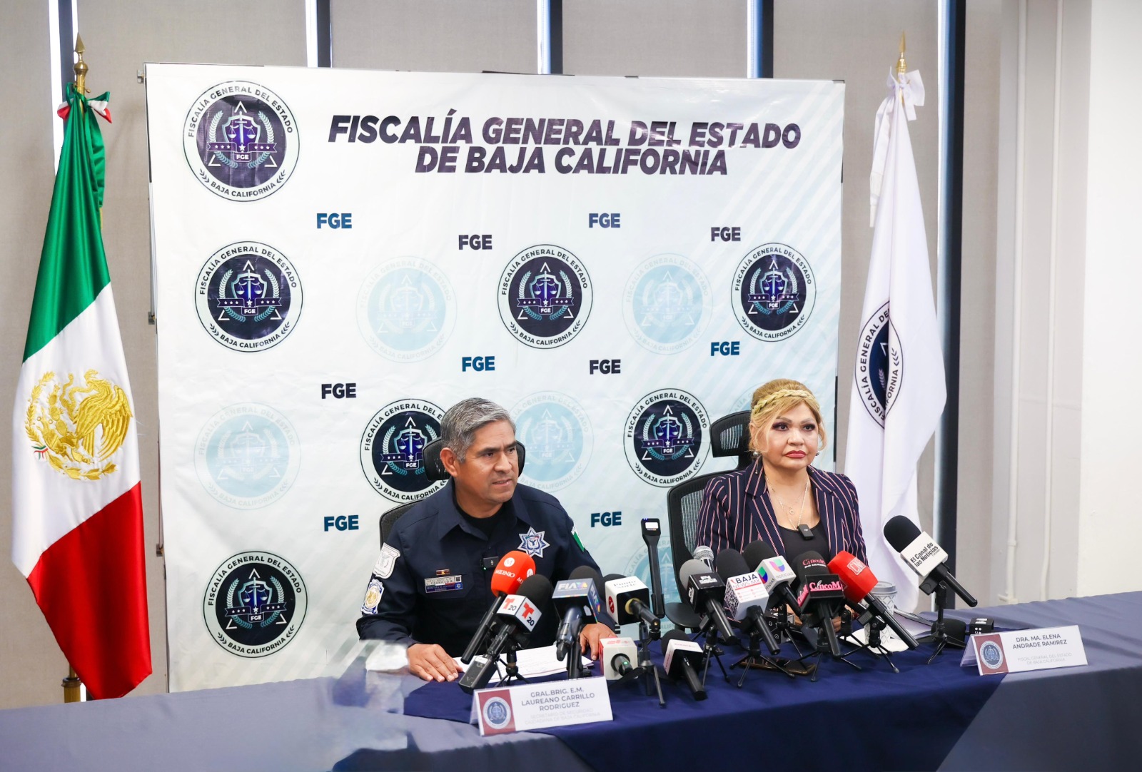TIJUANA, BAJA CALIFORNIA. - La Fiscalía General del Estado, bajo el liderazgo de la Fiscal General, Dra. Ma. Elena Andrade Ramírez, en coordinación con el Secretario de Seguridad de Baja California, General Laureano Carrillo, ofrecieron una conferencia de prensa en las instalaciones de la FGE en Tijuana para informar sobre los avances significativos en las investigaciones que se encuentran en curso tras los recientes hechos de alto impacto registrados en distintos puntos de la entidad.