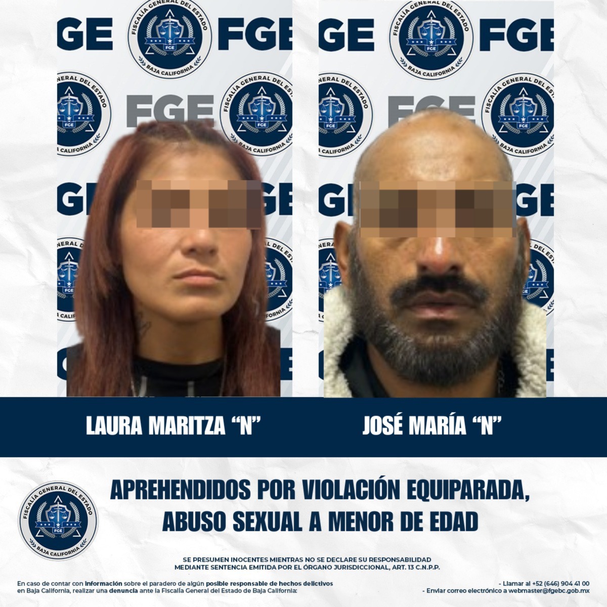TIJUANA, BAJA CALIFORNIA. - La Agencia Estatal de Investigación, adscrita a la Fiscalía Regional de Tijuana, logró cumplimentar dos órdenes de aprehensión por colaboración con la Fiscalía General del Estado de Michoacán, en contra de José María “N” y Laura Maritza “N”, por su presunta responsabilidad en la comisión del delito de violación equiparada, abuso sexual en agravio de una persona menor de 16 años de edad, dentro de un mismo caso.