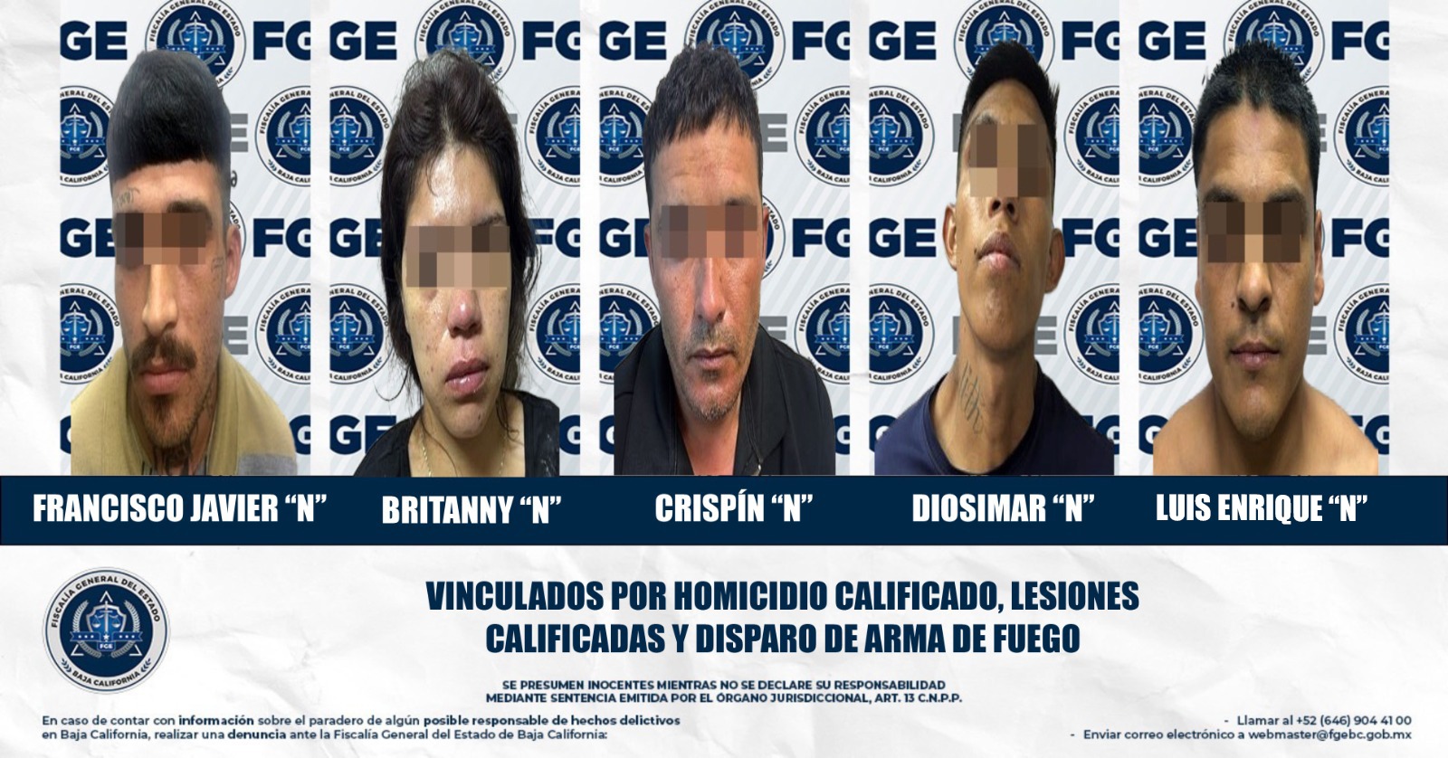MEXICALI, BAJA CALIFORNIA. - La Fiscalía General del Estado (FGE), a través de la Fiscalía Especializada en Delitos Contra la Vida, logró la vinculación a proceso penal de cinco presuntos integrantes de la célula criminal conocida como “Los Piscacha”, por su probable participación en los delitos de homicidio calificado, lesiones calificadas y disparo de arma de fuego.