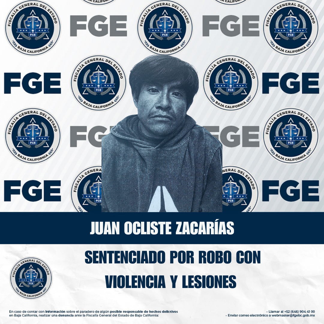 ENSENADA, BAJA CALIFORNIA. - La Fiscalía Regional de Ensenada logró una sentencia de 5 años, 6 meses y 3 días de prisión contra Juan Ocliste Zacarías, responsable de agredir y robar con violencia a dos adolescentes.