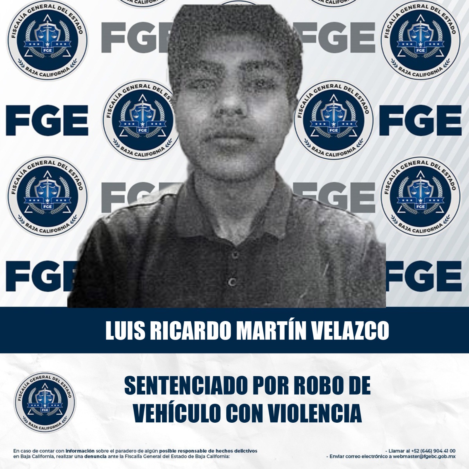 TIJUANA, BAJA CALIFORNIA. - La Fiscalía Regional de Tijuana obtuvo una sentencia condenatoria en contra de Luis Ricardo Martín Velazco, por su responsabilidad en el delito de robo de vehículo con violencia, a través de un procedimiento abreviado.