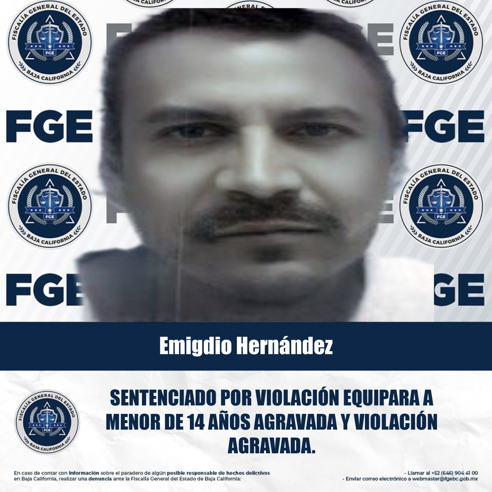 MEXICALI, BAJA CALIFORNIA. - En el firme compromiso de combatir la impunidad en actos de violencia contra niñas, niños, mujeres y personas en situación vulnerable, la Fiscalía General del Estado logró una sentencia condenatoria de 16 años de prisión contra Emigdio Hernández, declarado penalmente responsable de cometer un delito violación equiparada a menor de 14 años agravada.